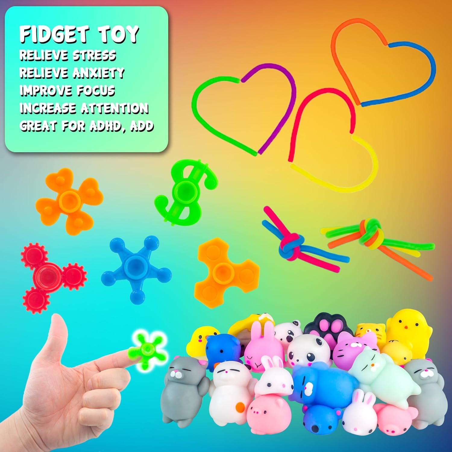 - VALUABLE TOY ASSORTMENT: Package Provide 110 PCS Toys Total, Include Slap Bracelets, Push Bubbles Bracelets, Push Bubbles Keychain, Squeeze Animal, Sticky Hands, Pull-back Car, Animal Tumbler, Mini Spinner, 3D Puzzle, Puzzle Toys, Fidget Stretchy String, Animal stickers.