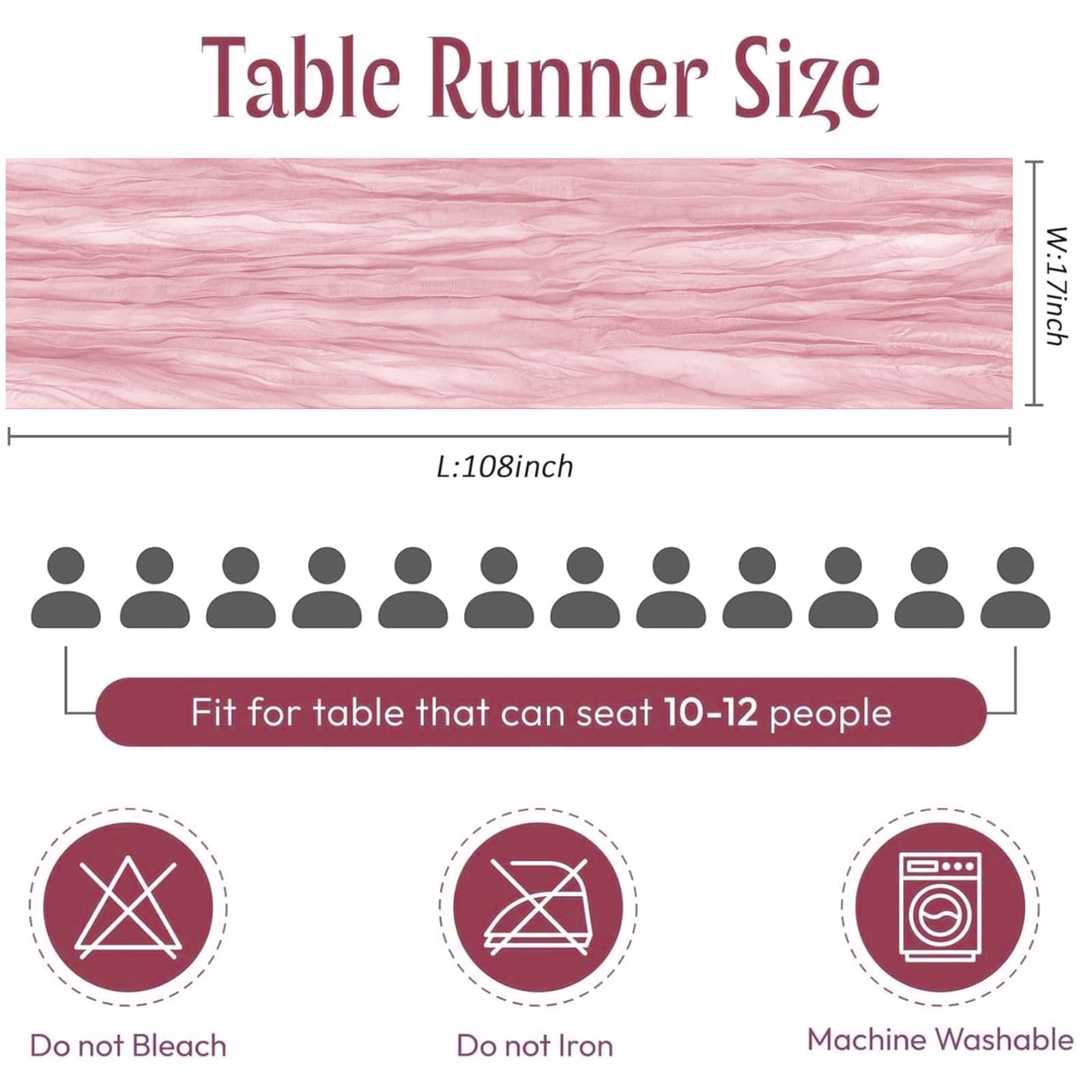 - Excellent Material: The table runner is made of excellent polyester. It uses unique indentation technology to make the fabric of the table runner naturally show a beautiful and elegant wrinkle texture. The surface of the cheesecloth table runner is smooth and skin-friendly. It has excellent drape and has Good durability and flexibility, will not fade, can hang elegantly on your banquet table