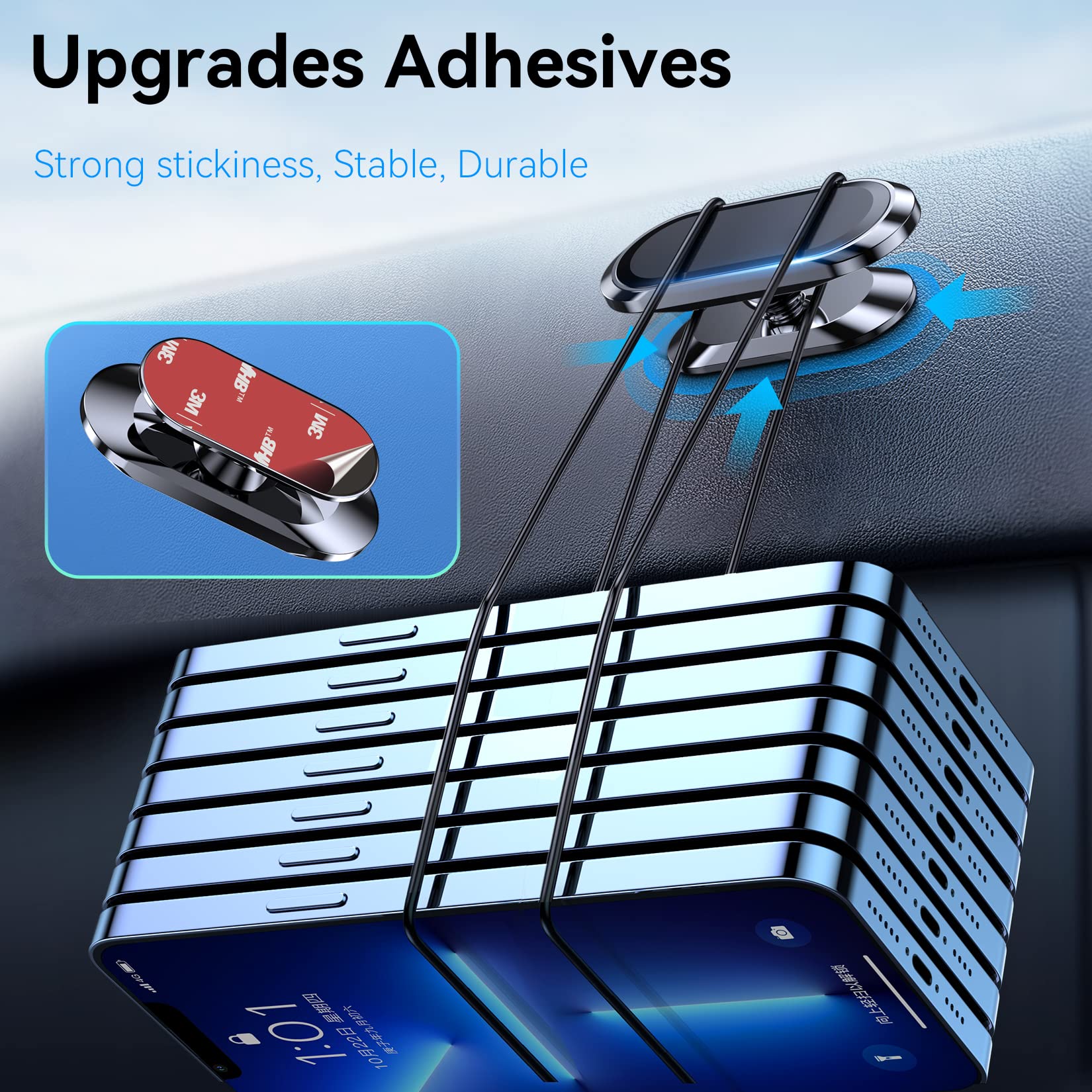 - 【SUPER STICK FORCE】: VHB adhesive provides strong stick force between the dashboard and the car phone holder, which can firmly stick to any plane in the car, fix your device, adapt to a variety of road conditions such as sudden braking, speed bump, and rugged mountain road.
