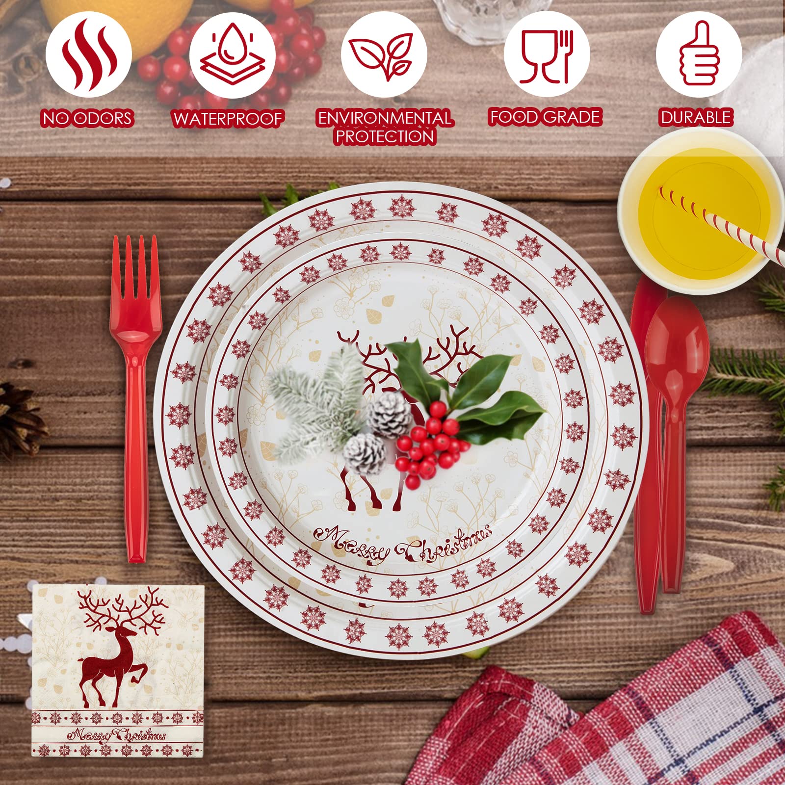 - Easy Cleanup: This disposable tableware set provides the convenience of effortless cleanup after your holiday festivities. Simply dispose of the used items, allowing you to focus on enjoying time with family and friends rather than worrying about washing dishes.