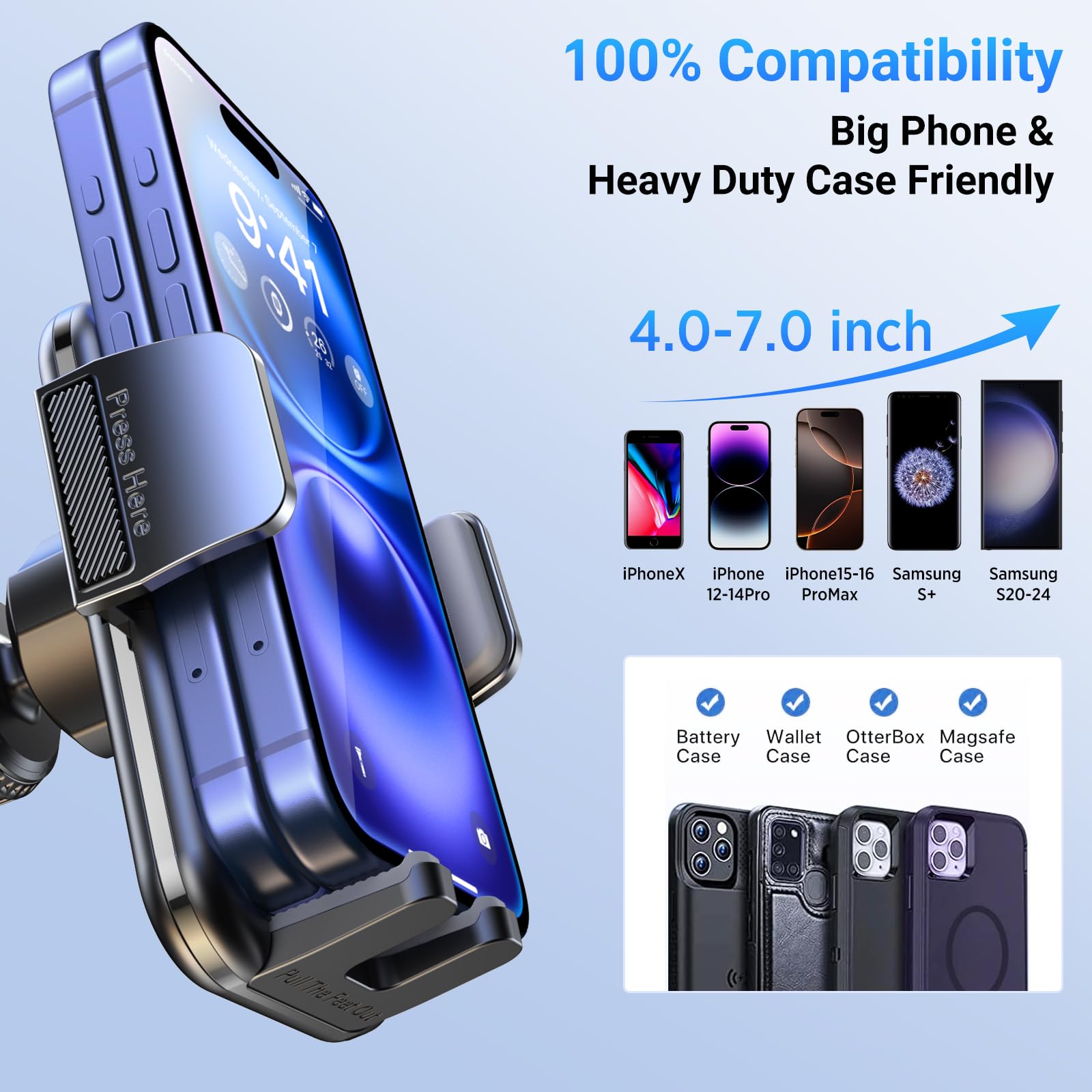 - Effortless Installation & 99% Compatibility - Streamline your driving experience with our iphone car mount. Fast, easy, and hassle-free phone attachment and detachment in a click. Simplify complexity, enjoy your journey! The up and down position adjustable holder design is built to not obstruct headphone and charging cables, as well as volume and power buttons. Compatible with 99% of car models and fits smartphones from 4.0 to 7.1 inches, including thick cases. It's a must-have for your journey.
