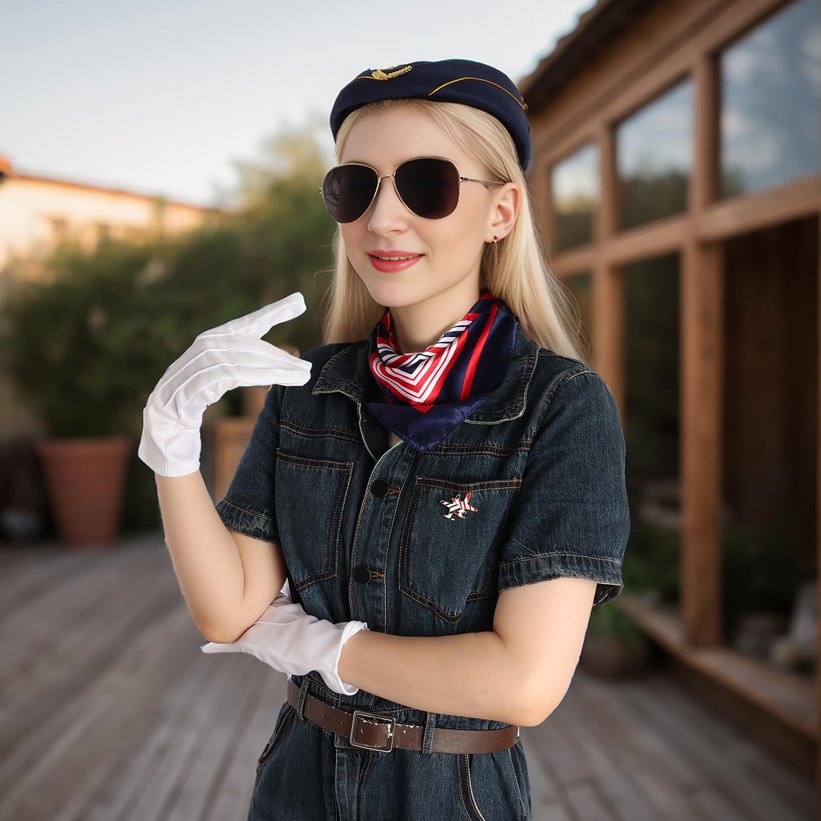 - Flight Attendant Costume Accessory Set Contents:This flight attendant costume set includes a blue female flight attendant hat, 1 flight attendant scarf, 1 pair of sunglasses, 1 pair of white flight gloves, 1 airplane pin, the design and color matching of the classic female attendant costume is a necessary component to complete the flight attendant dressing up, which is fully able to meet your needs for attending all kinds of parties and for the dress code of the flight attendants.