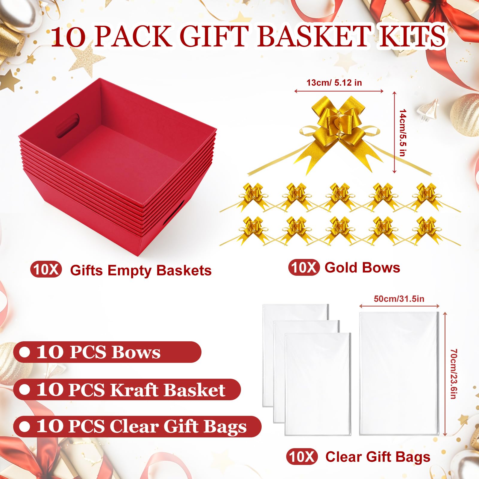 - 【Complete Gift Basket Set】 When you purchase our 10-pack empty gift basket set, you'll receive 10 premium red baskets, 10 clear plastic bags, and 10 elegant gold bows - a complete packaging solution for all your gifting needs. This all-inclusive baskets for gifts empty set provides everything required for professional presentations, eliminating the hassle of buying separate components while ensuring beautiful, ready-to-use packaging for any occasion.