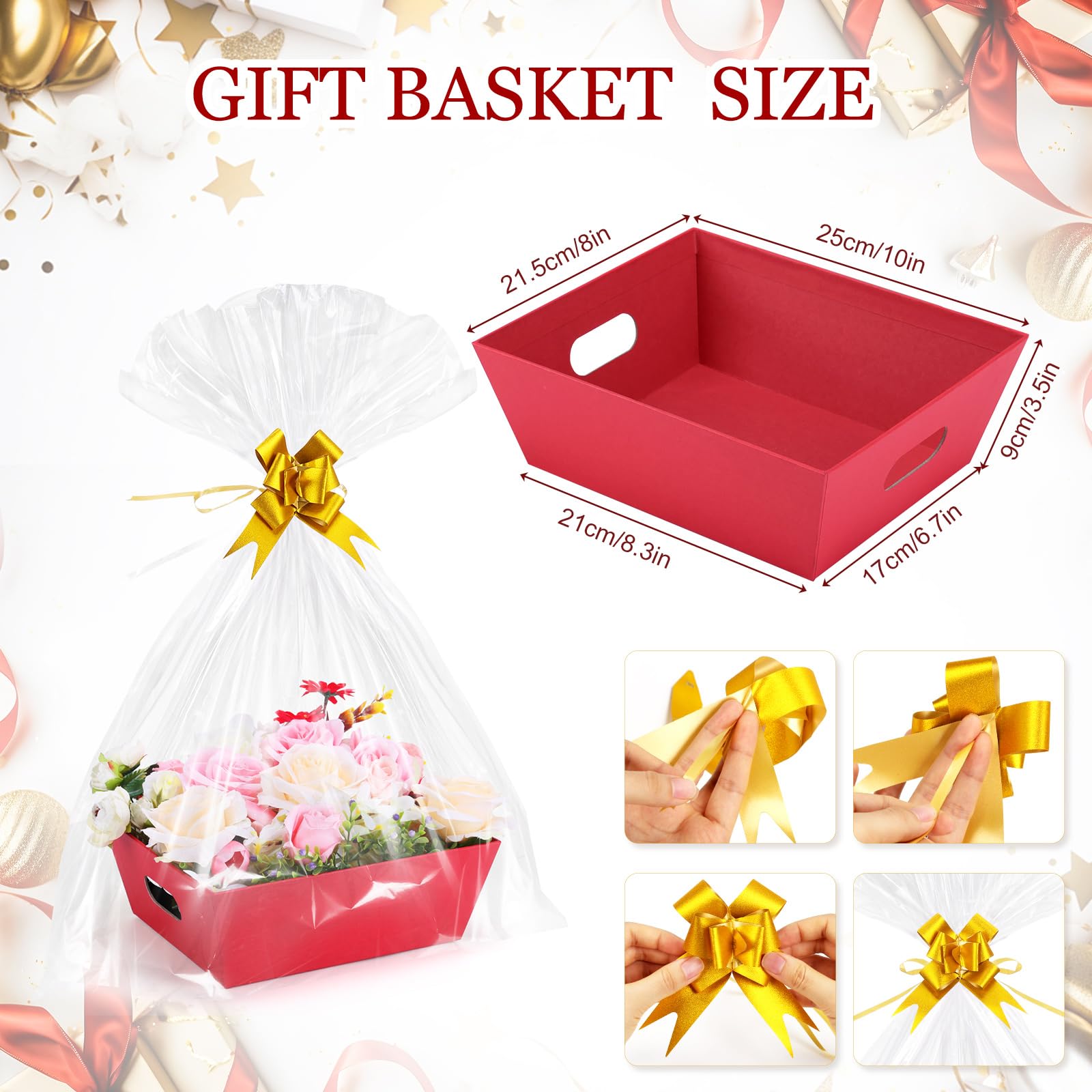 Details: 10PACK Baskets For Gifts Empty, 10 x 8”Thick Red Gift Basket with 10 Clear Gift Bags and 10 Pull Bows, Empty Gift Baskets for Christmas, Thanksgiving Wedding Birthday Party Wrapping Gift