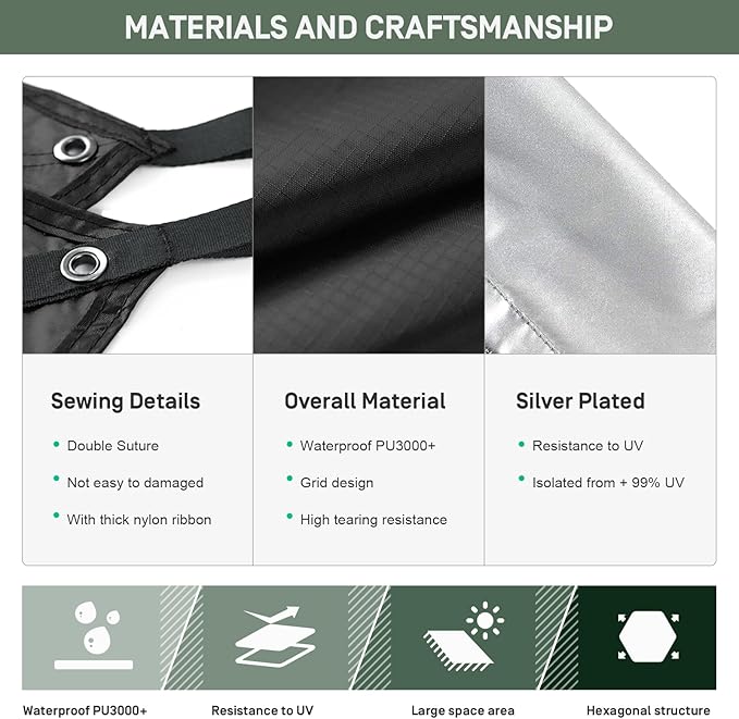 - [Easy Installation] The tarp is hexagonal in design and easy to open. It has 8 tie-down loops for multiple tie-down points. It also comes with 8 high quality aluminum ground spikes and 10 feet of lanyard, allowing you to set up quickly and securely in minutes.