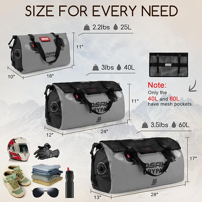 • WATERTIGHT PROTECTION: OSAH DRYPAK duffel bag is made of durable high-strength PVC, which is completely waterproof & snowproof. Ideal weekender bag for all your sailing, fishing, camping, sporting, boating, and motorcycling travel adventures.