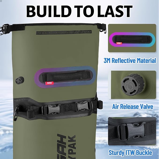 - SECURE ROLL-TOP CLOSURE - Our waterproof backpack is equipped with a roll-top closure system that ensures a tight, watertight seal, effectively keeping water out. This design keeps your belongings dry, even in the wettest conditions. The roll-top mechanism also provides easy access to your items and allows you to adjust the bag's size based on your load, offering both convenience and versatility on your adventures.