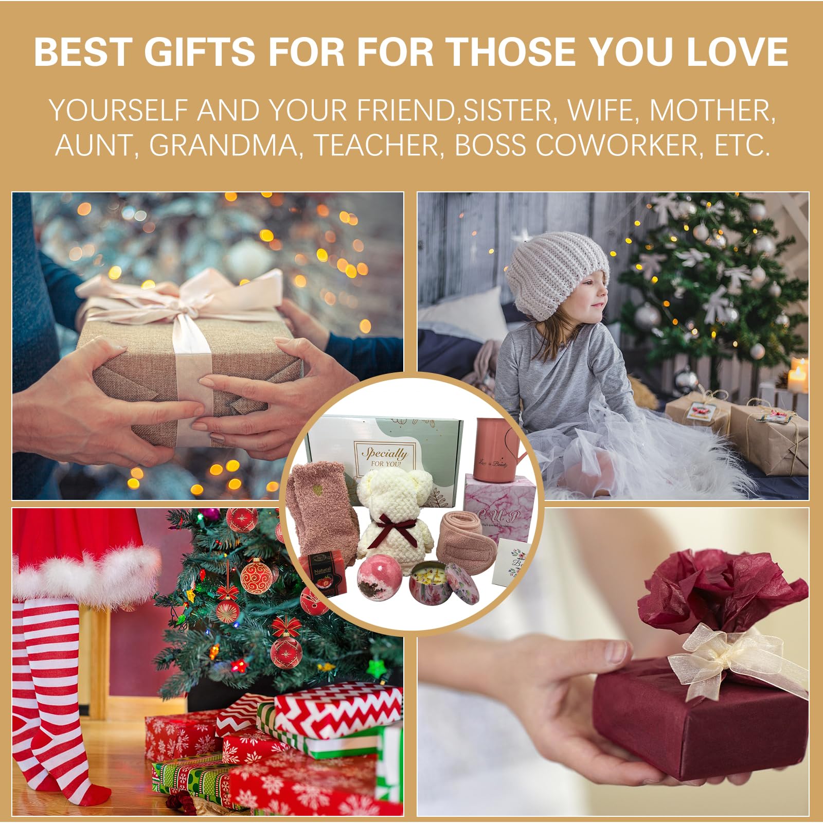 - 【WHAT ARE INCLUDED IN THE BOX】This personalised birthday gift set for women includes a unique gifts coffee mug, a fluffy bear towel, a scented floral rose candles gifts for women, one rose scented bath balls, a pair of heart shape socks, a handmade essential soap, a hairband and a plain gift card. Each item in this gift baskets for women is exactly what she wants.