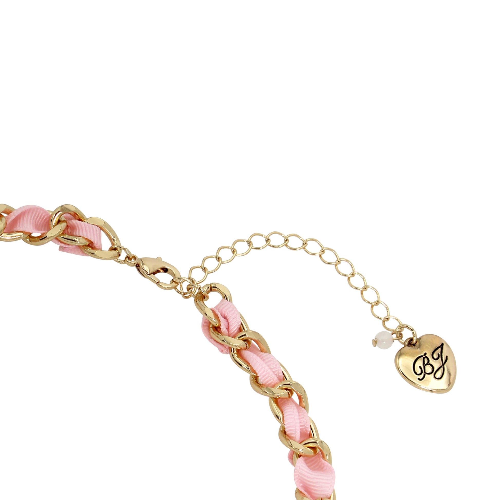 Striking necklace with woven pink ribbon and festive Christmas reindeer adorned with Santa hat and pearls. Necklace has an adjustable lobster clasp closure. Made from metal, glass, imitation pearls and fabric ribbon.
