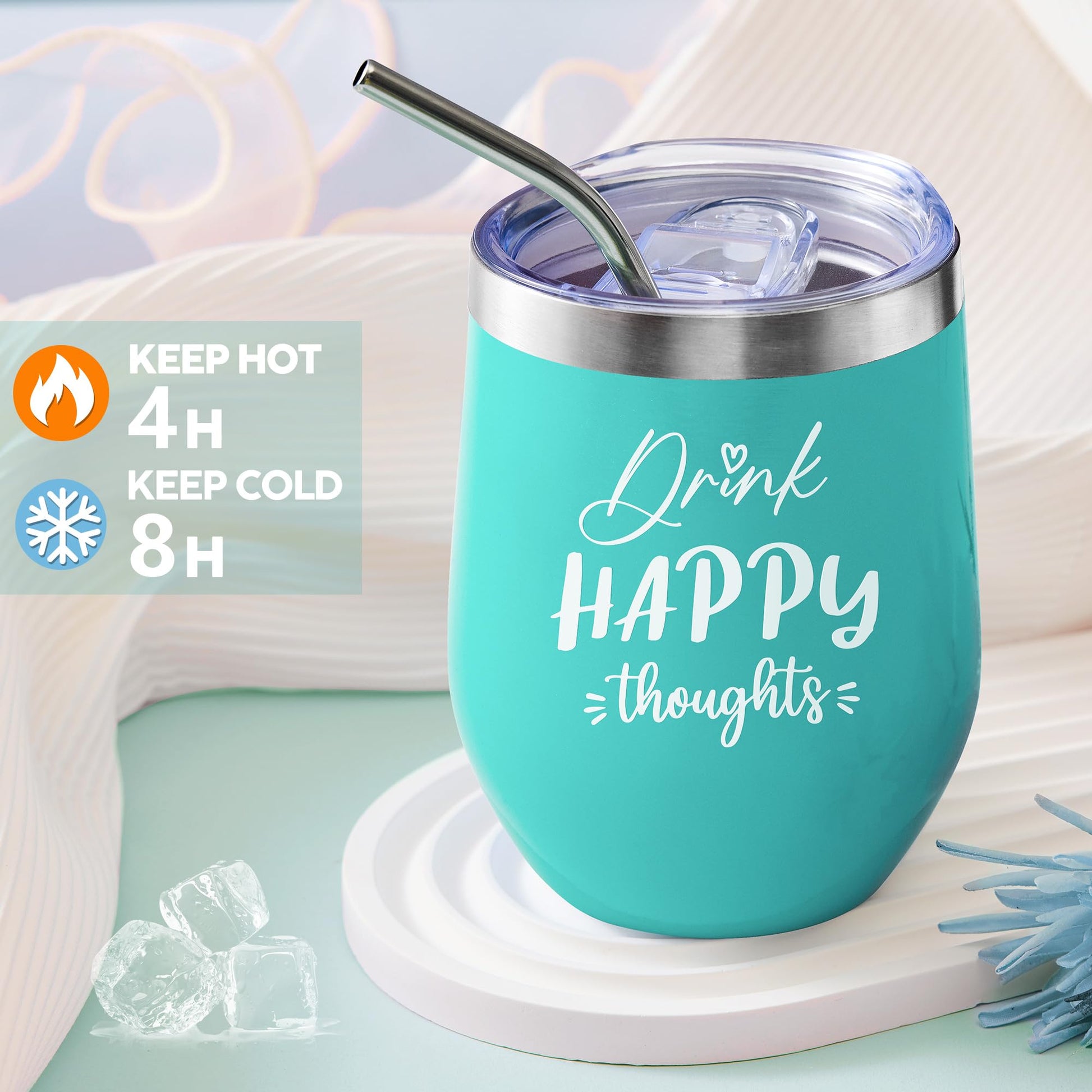 - THOUGHTFUL INSULATED VACUUM TUMBLER GIFT SET: Crafted from 18/8 food-grade stainless steel with double-walled vacuum insulation, this sweat-free 12oz insulated tumbler keeps drinks hot for 6 hours and cold for 9 hours. The motivational quote, 'Drink Happy Thoughts,' will brighten her day as she enjoys coffee, tea, or wine—making it an ideal relaxation gift for best friends mom sister, daughter, grandma, wife, girlfriend, coworkers teacher