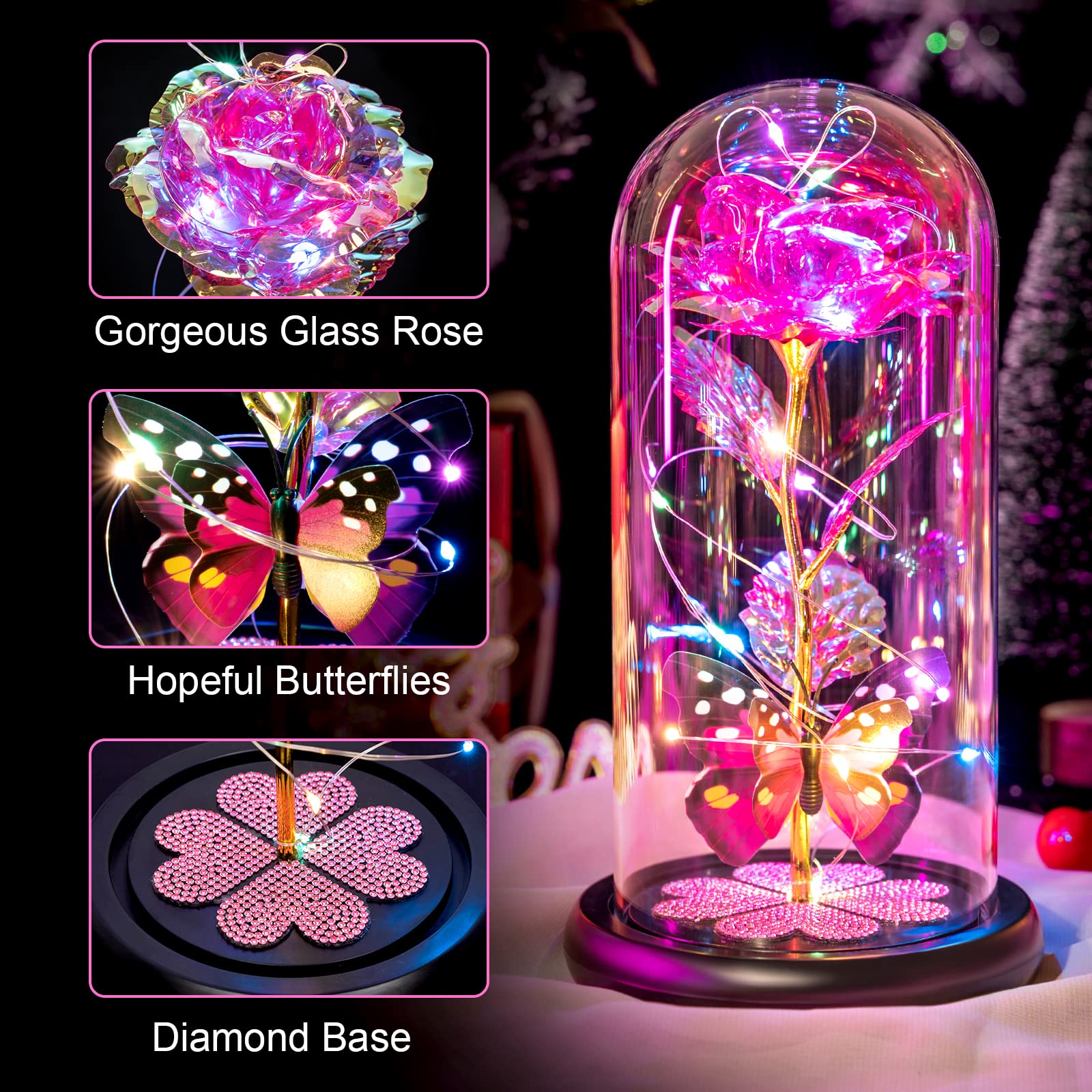 - Rose Gifts for Mom: Forever Glass Rose with Butterfly & Heart Crystals Base: Plated with a 3' extra-large rainbow galaxy rose, one unique butterfly, and 4 shiny Heart-shaped crystals on a black plastic base. The glass rose is wrapped around an LED Strip tree lamp, Powered by 3 AAA batteries(not included). Just turn on the bottom switch, and it will glow warm light that can make your mom, wife, or grandma's heart feel pleasure on Mothers Day, Valentines day, Birthday, Anniversary, Christmas