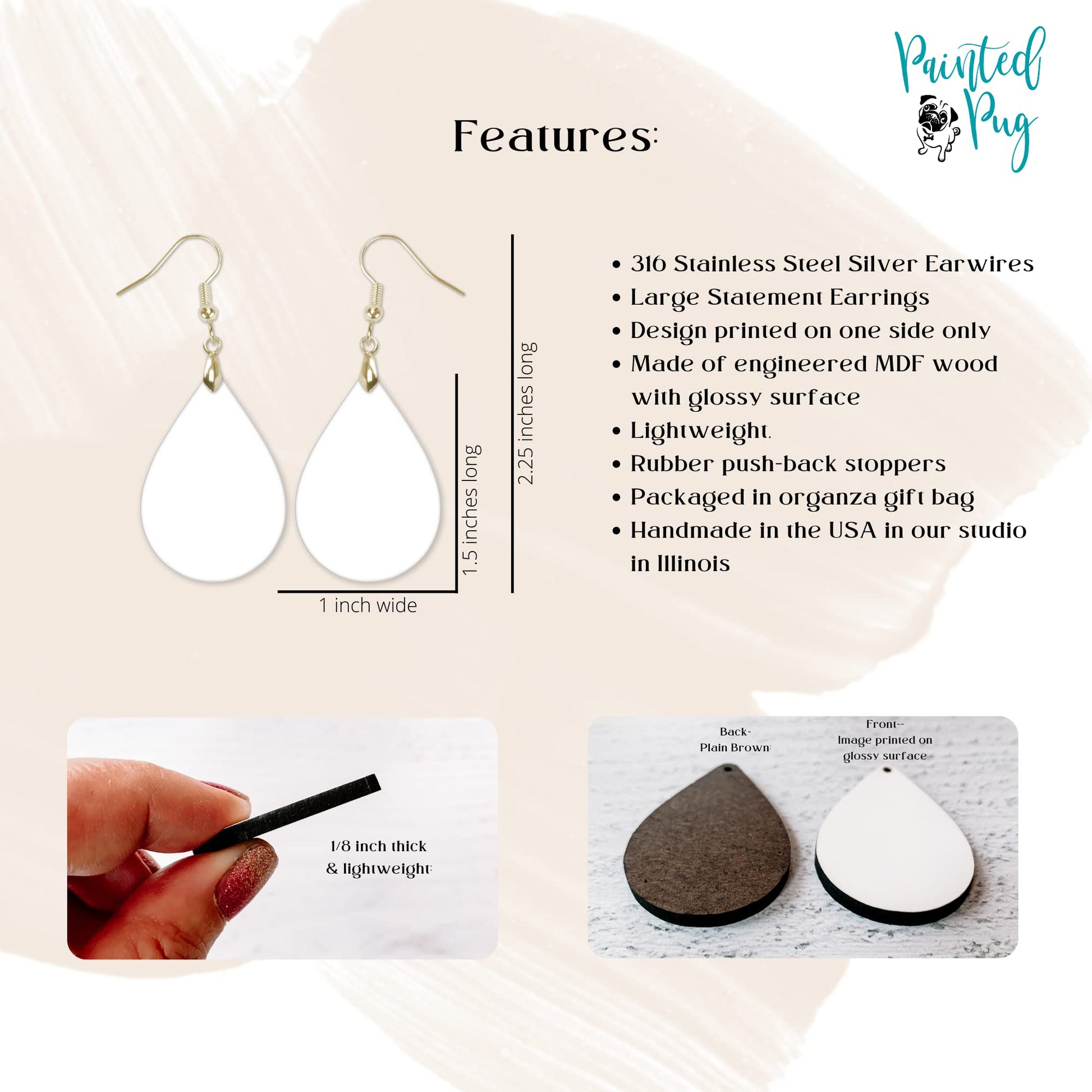 - Premium Craftsmanship: Crafted from a unique engineered wood with a lustrous glossy surface, each teardrop is cut to precision, ensuring every detail of the holiday-themed design is vividly printed on the glossy surface. The charming charred finish along the edges adds a rustic touch. Unlike other imitations, our earrings contain no cork, cardboard, glitter, vinyl, or stickers and proudly feature the design on both sides.