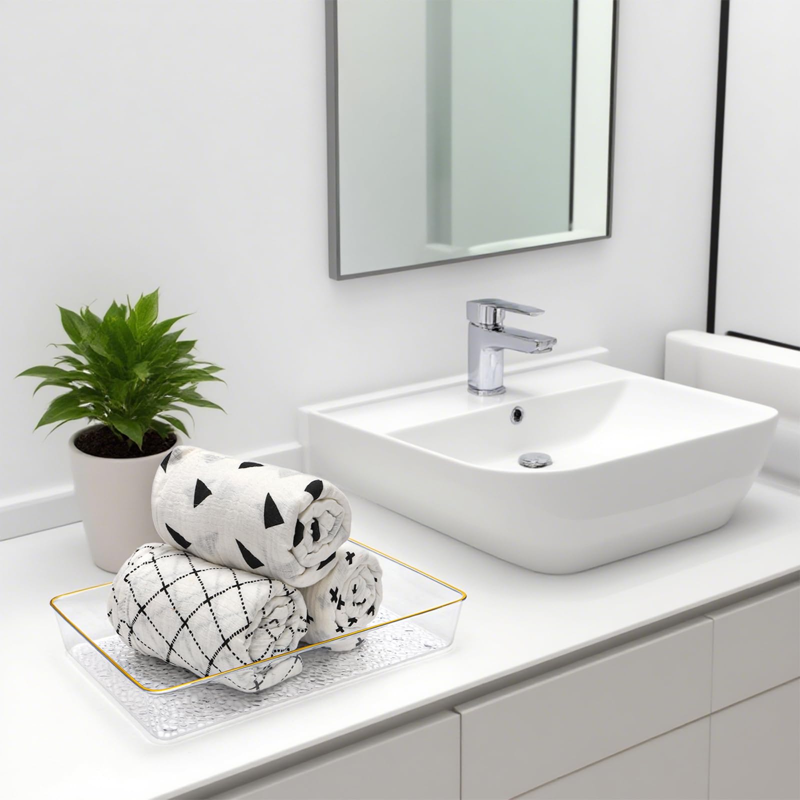 Cididu 4 Pack Clear Serving Trays, Deep Serving Platters Rectangle 12'' x 8'', Decorative Tray with Gold Rim, Reusable Plastic Tray Organizer for Coffee Table Pantry Party Food Display Spill Proof