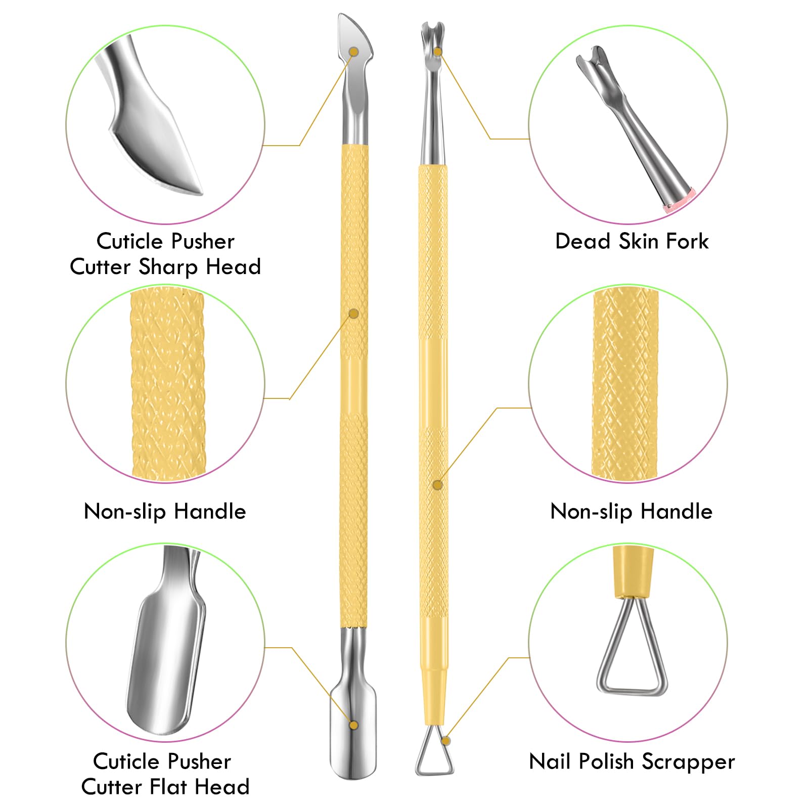 - 5 in 1 Manicure and Pedicure Tool Set -- Including cuticle trimmer, cuticle pusher cutter flat head, cuticle pusher cutter sharp head, dead skin fork and triangle nail polish scraper. Use the flat head to gently push back the cuticles on your nails; Use the trimmer to neaten cuticles. Use the triangle head to peel or remove gel nail polish; Use the cuticle pusher cutter sharp head push down the cuticles at the corners of your nails. They are great beauty tools for manicure and pedicure.