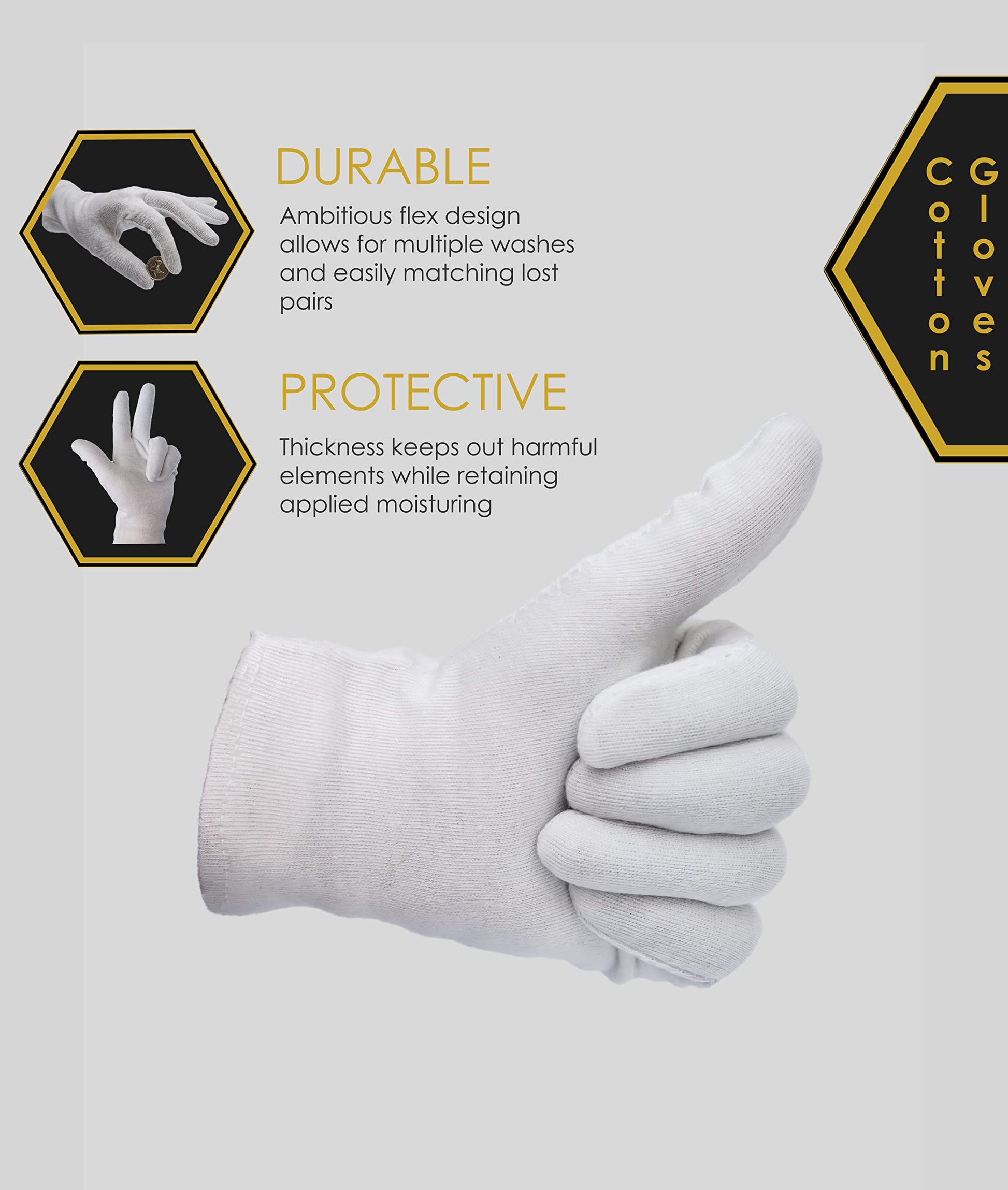 - ★HIGH QUALITY: cotton gloves bulk set come with 12 pairs (24 pcs). Premium white cotton gloves, enough for long-time use. Soft, smooth, breathable, and lightweight that gives quite a comfortable feeling while wearing overnight or working.