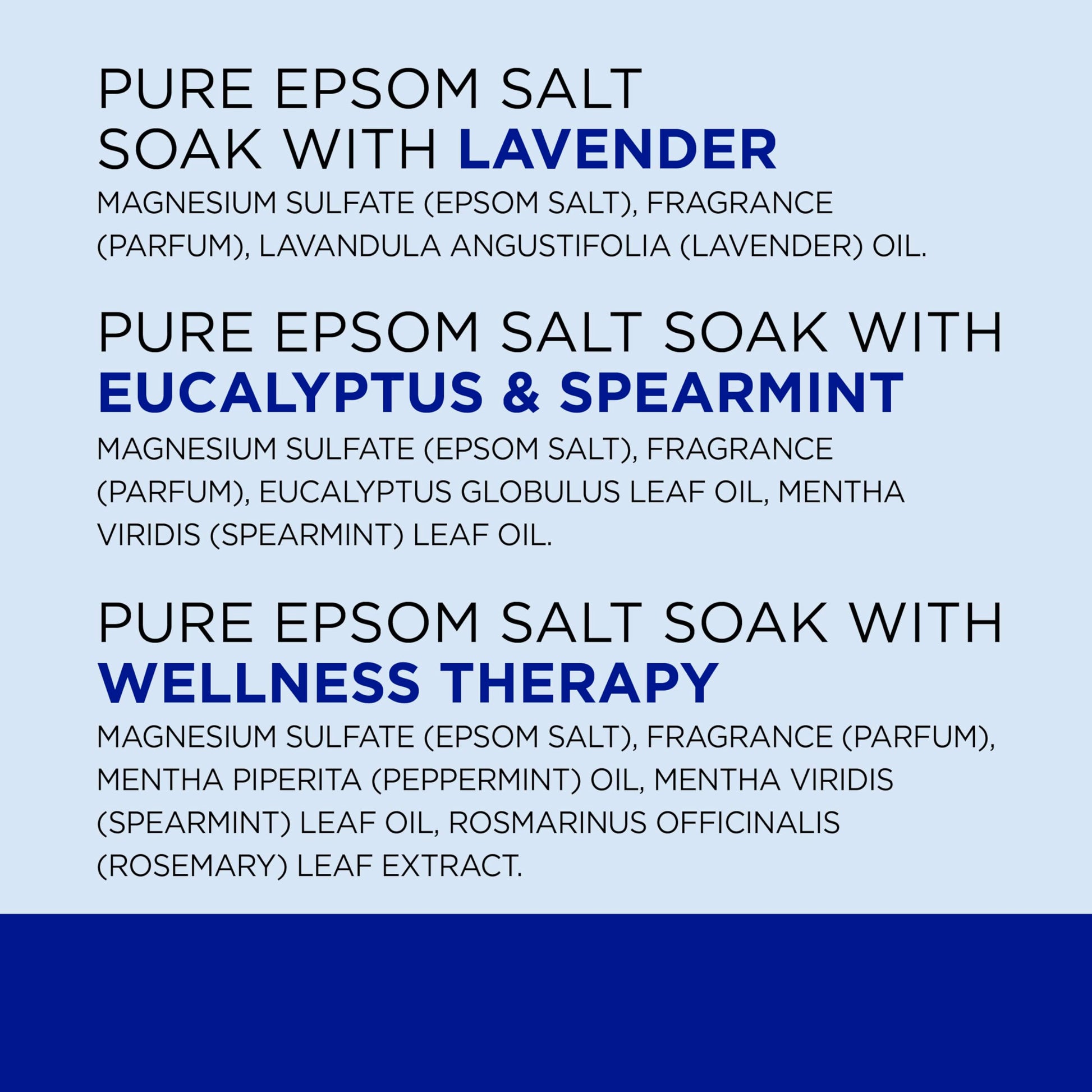 Details: Experience relaxation, stress relief, and wellness with Dr Teal’s Lavender, Eucalyptus & Wellness Pure Epsom Salt Trio. Each soaking solution features our signature Pure Epsom Salt to ease muscle aches and soreness. Help calm your mind before sleep with soothing lavender. Eucalyptus and spearmint will help clear your senses and reduce stress. Indulge in rosemary and mint to soften your skin and comfort your overexerted muscles. Soak in one of these self-care solutions or mix with your favorite Dr Teal’s body wash to create an exfoliant. Dr Teal’s products are vegan and cruelty-free and contain no harsh ingredients such as parabens and phthalates.