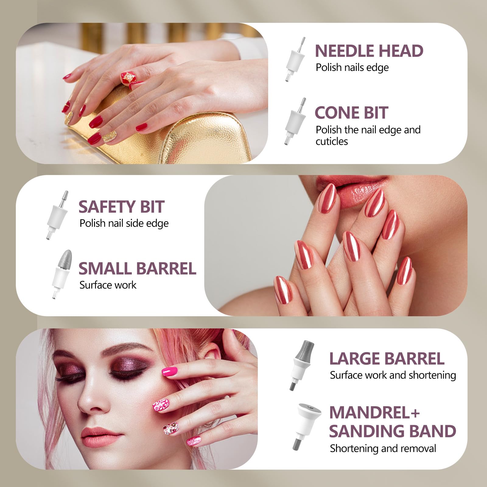 - Low Noise and Easy to Use: This nail drill features a compact and lightweight aluminum body design with high heat dissipation efficiency. High quality electric nail drills are equipped with high-quality bearings and motors to ensure smooth operation and low noise of electric nail files. It is suitable for both home use and salon use. Simply connect the power cord to start working.