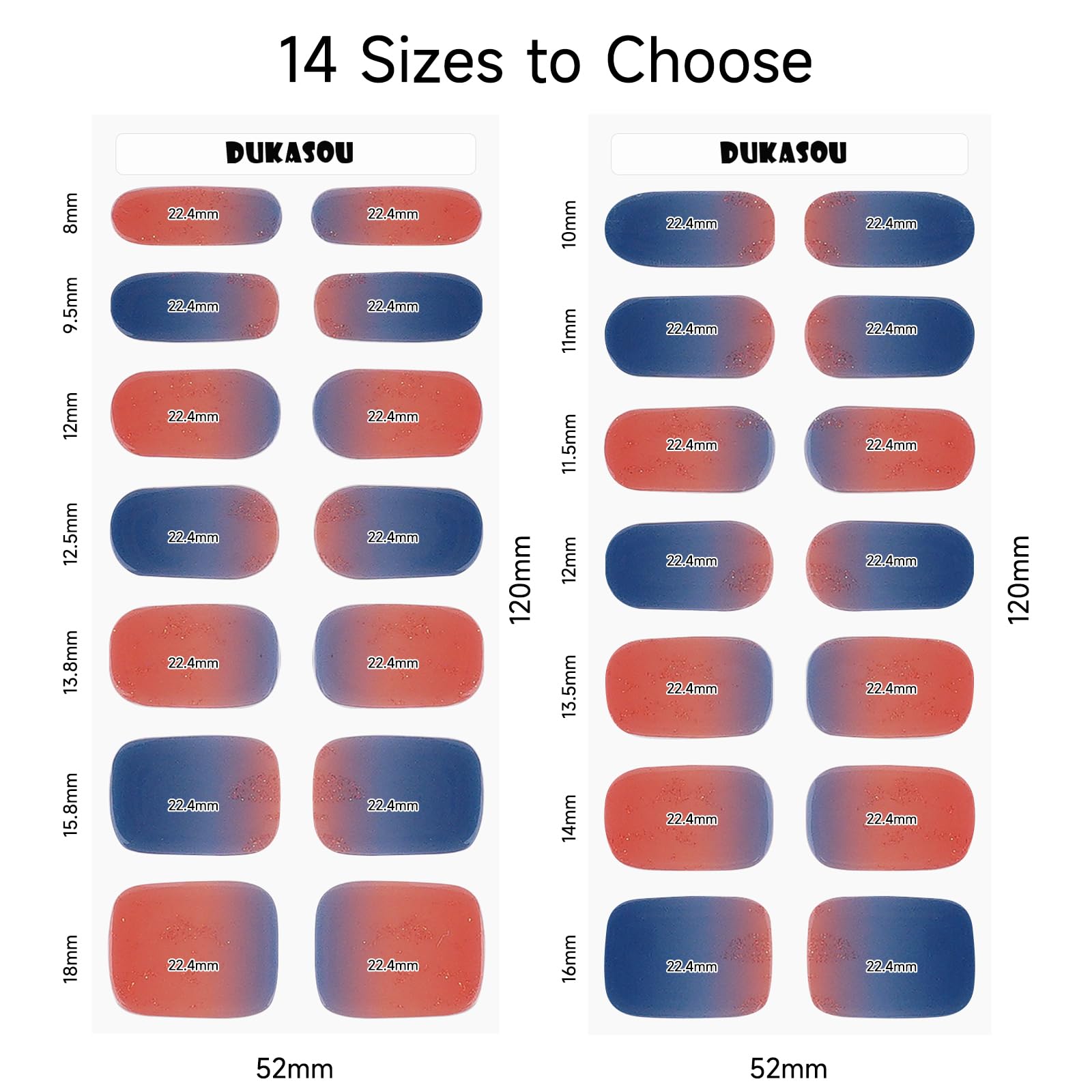 - Gel nail stickers set: DUKASOU semi cured gel nail strips package contains 28 stickers in 14 different sizes, it comes with 2 prep pads, 1 nail file, and 1 wooden stick (pressing the edge and removing), suitable for all nail sizes and shapes