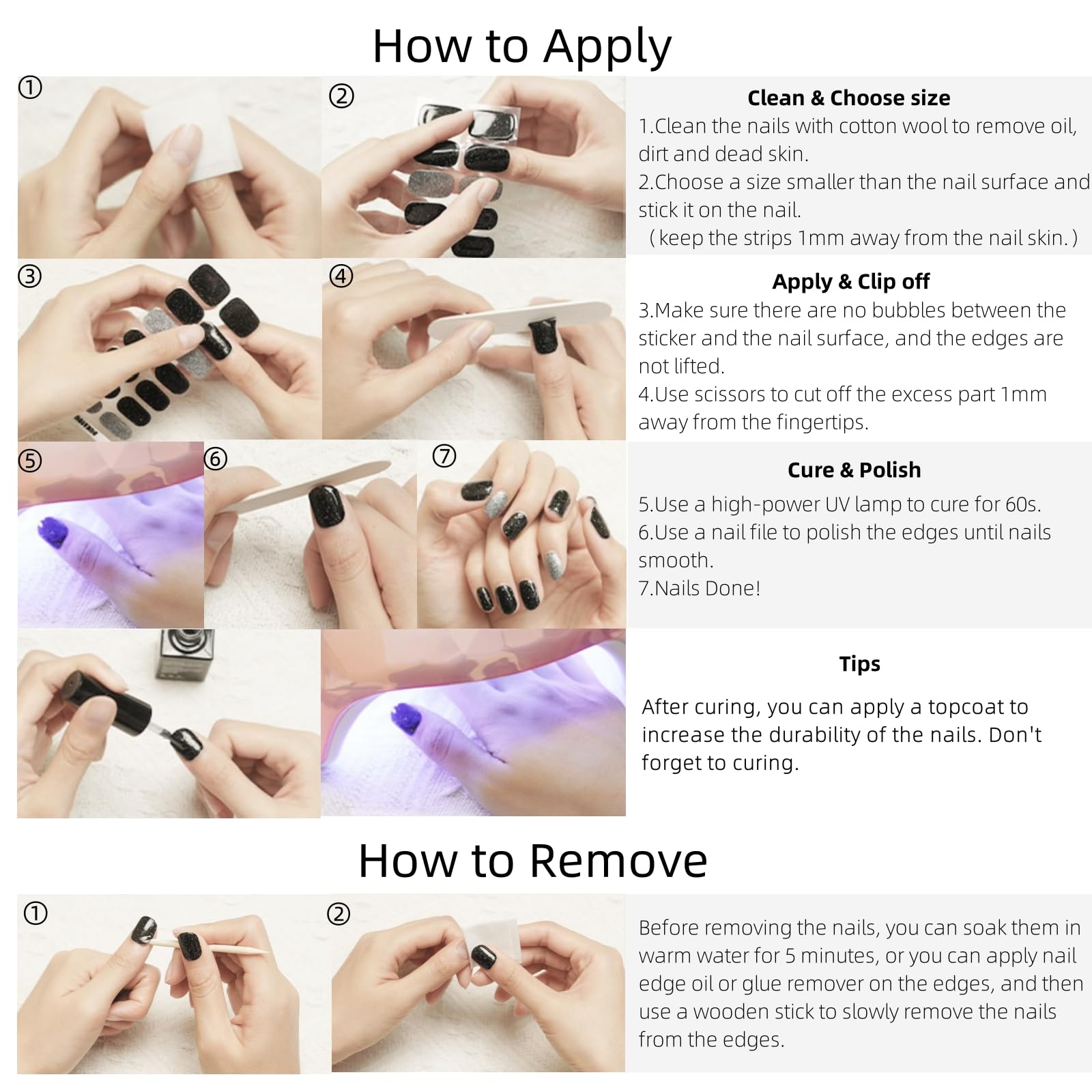 - DIY nails in 20 mins: polished and clean the nail surface, choose a smaller size than the nail surface, pressed tightly the entire nail surface and the edge, cut off the excess part, curing 60s, after cooling 20s, polish the fingertips will keep 2 weeks
