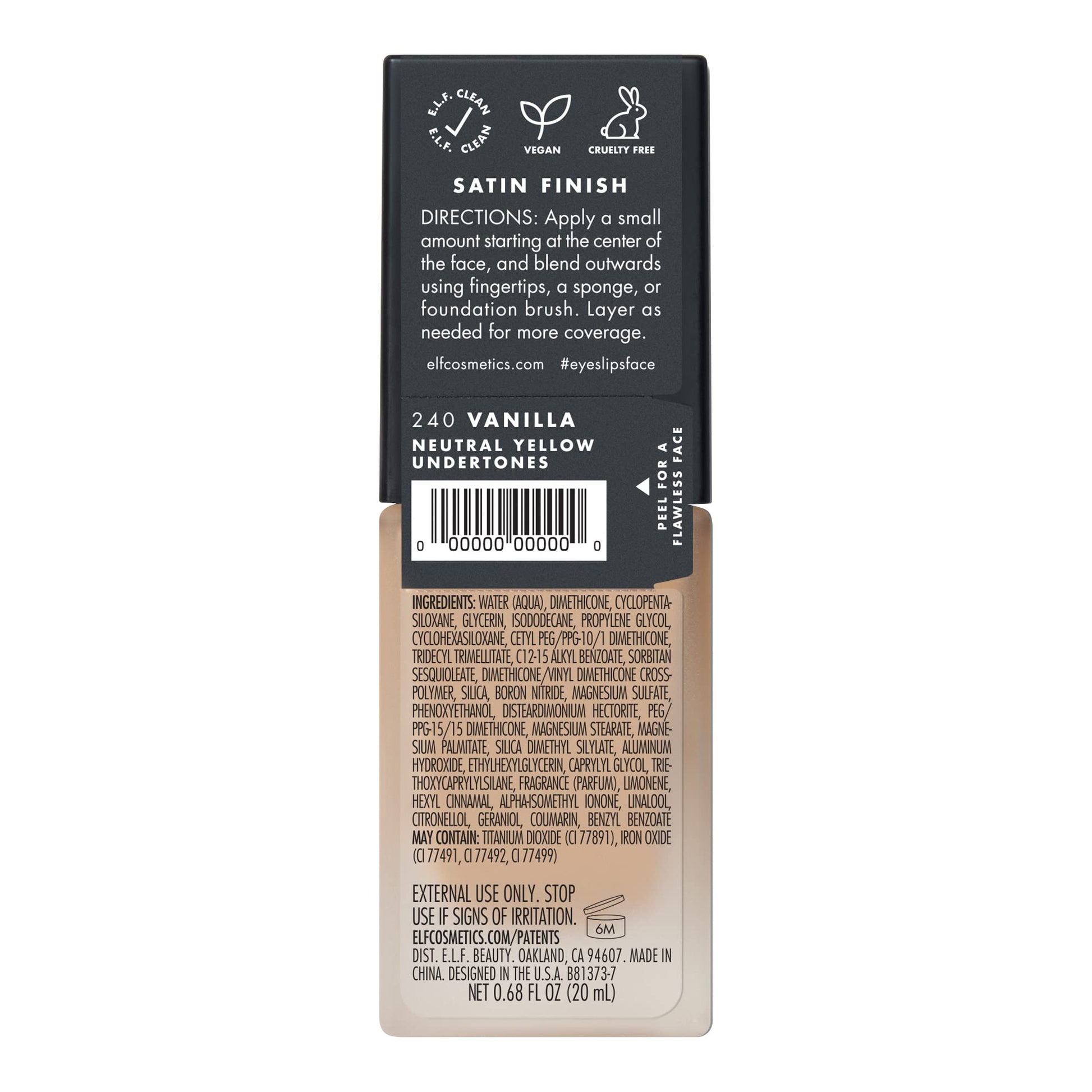 Details: The flawless finish Foundation is your secret weapon to putting Your best face forward. The holy grail of full-coverage foundations, this creamy liquid formula glides on skin like a dream - setting the stage for whatever look your heart desires. For sheerer coverage, mix with your daily moisturizer. For a dewy glow, mix with a shimmery facial moisturizer. Set with a light powder application for a minimalist approach, or go bold with Red lips and black eyeliner for the full-on maximalists. Your imagination is the limit. E.L.F. Makes the best of Beauty accessible to every eye, lip, and face. Your originality is infinite, and we are inspired by what makes you unique. From the early explorer to the trend-obsessed beauty junkie-glam or bare faced, minimalist, maximalist and every look in between-we are for every eye, lip, and face. Proud to be 100% vegan and cruelty-free, worldwide.