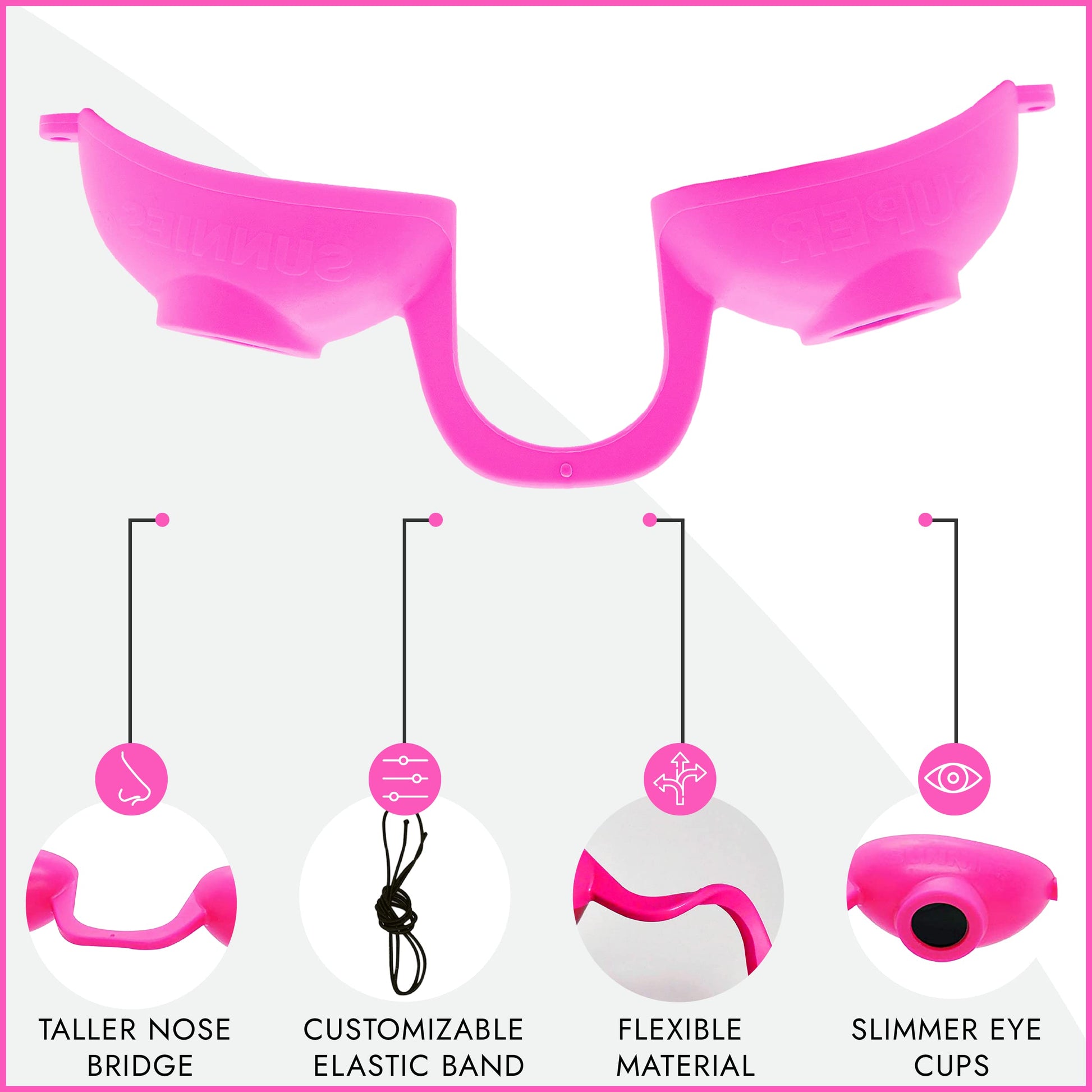 - EVO EYESHIELDS: Super Sunnies tanning goggles have offered uncompromising protection for your eyes both indoors and outdoors. This Evo Tanning Eyewear has a flexible high-rise nose bridge to eliminate tan lines. The tanning glasses have an elastic headband to assure the perfect fit which accommodates any facial structure.
