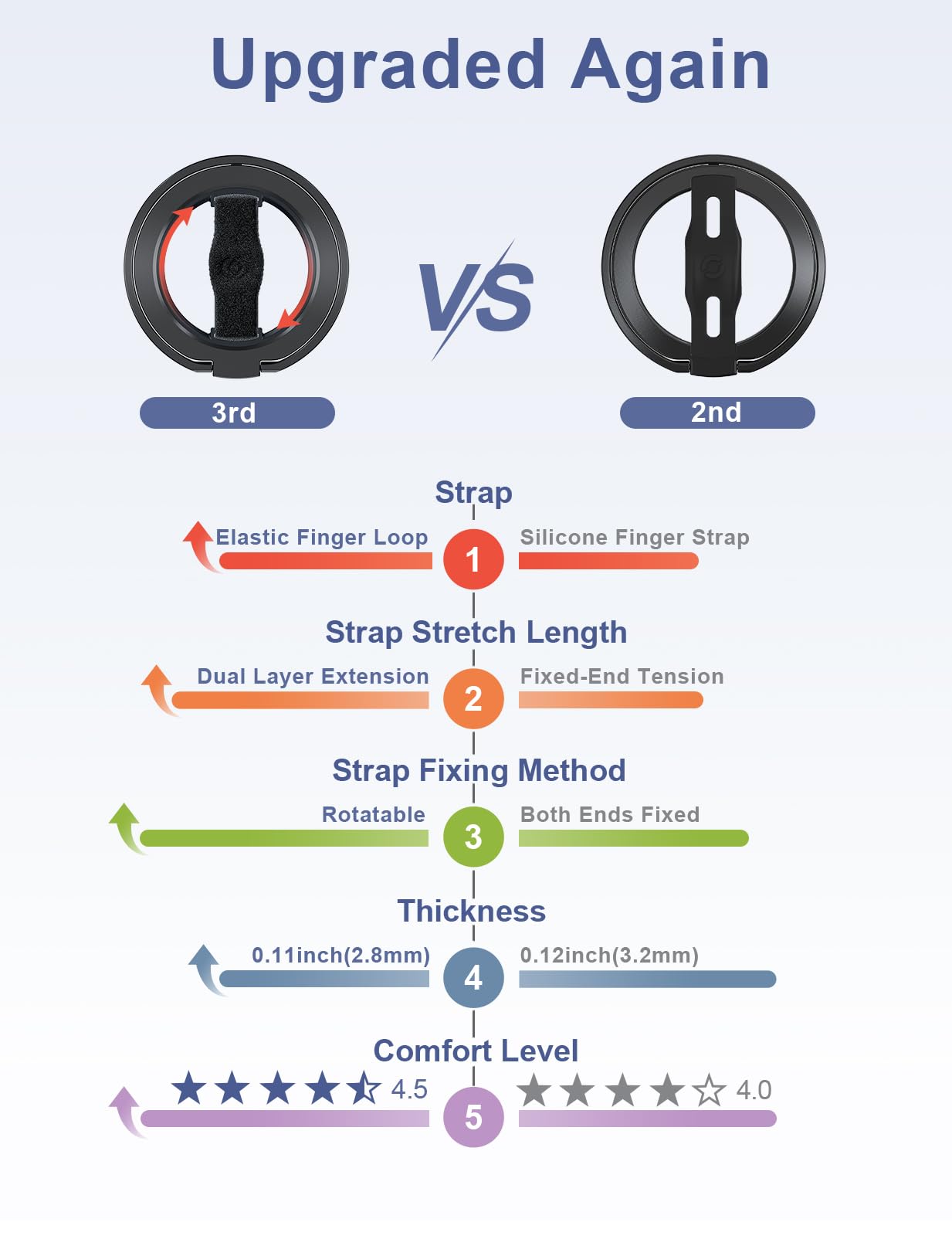 - Comfortable Elastic Phone Grip: This strap features a more comfortable and highly stretchable, high-elastic strap. With its extended length, it greatly reduces the pressure on the fingers when using the strap. The strap is fixed on a rotatable inner ring, allowing you to easily adjust your phone to the most comfortable angle while using the grip.