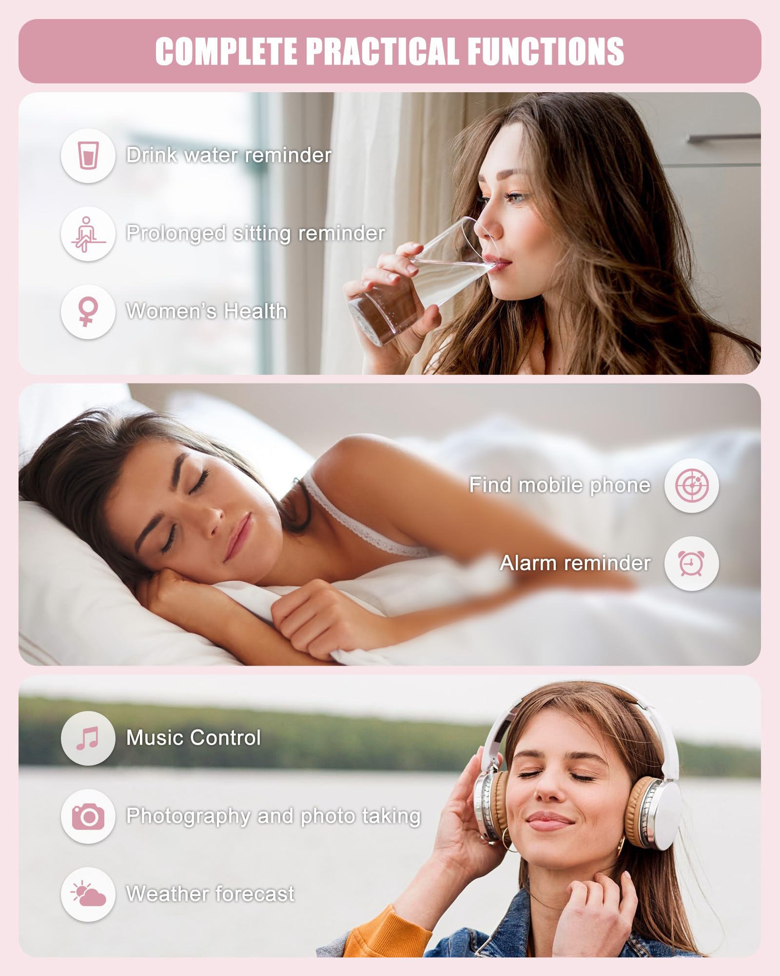- 【Health & Lifestyle Management】Stay on top of your health with 24/7 real-time tracking of heart rate, blood oxygen, and sleep patterns. Get in-depth sleep analysis and personalized reports to improve your sleep quality. Additional smart features include weather updates, hydration and sedentary reminders, and female health tracking, helping you maintain a balanced and healthier lifestyle.