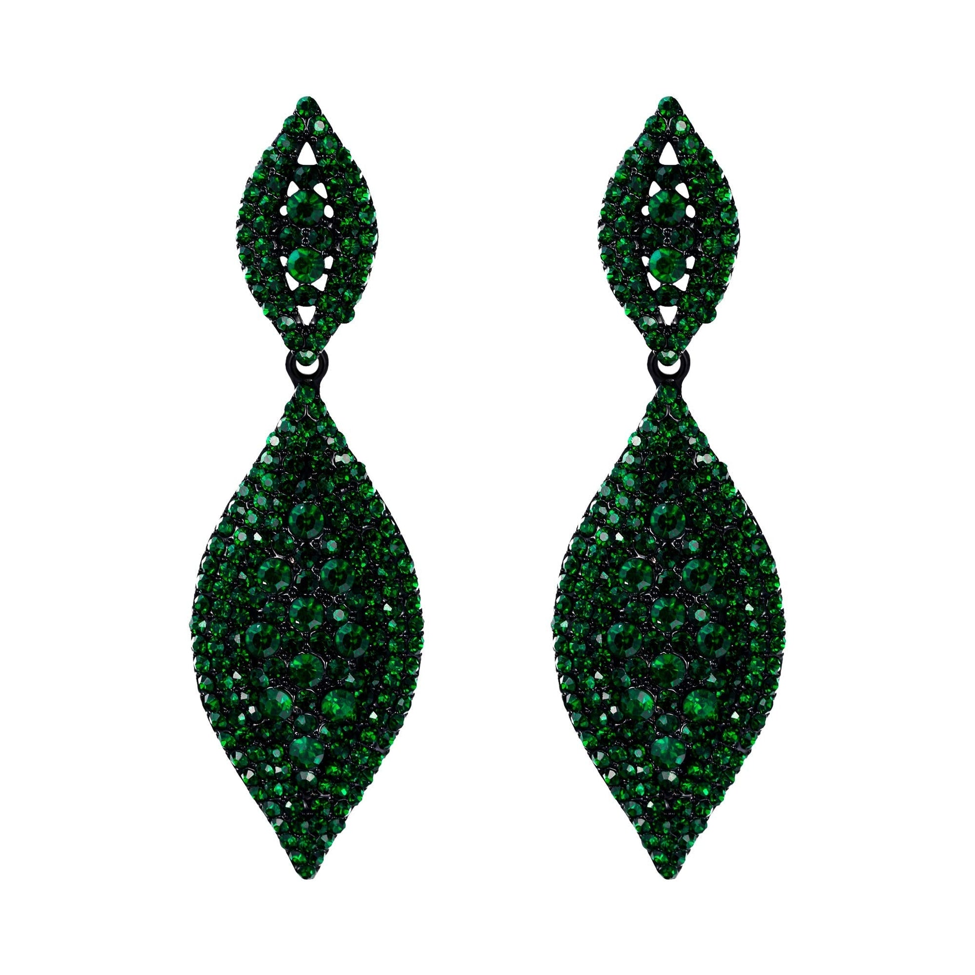 Flyonce Women's Rhinestone Crystal Wedding Bridal 2 Leaf Drop Dangle Chandelier Earrings Large Big Costume Statement Earring Green Black-Tone 3.3"