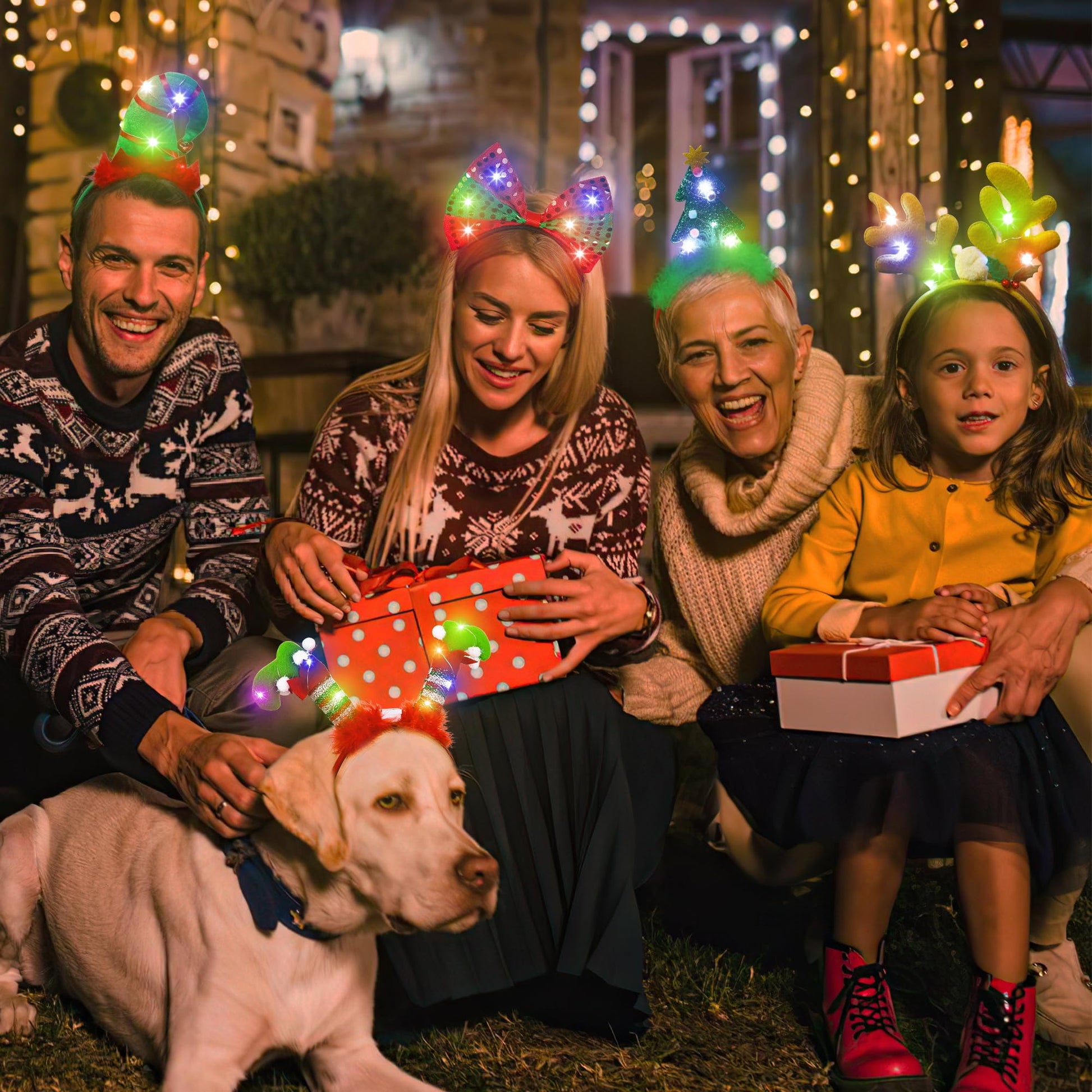 HOVACY Christmas 6 PCS LED Light Up Headband, Reindeer Antler Santa Hat Christmas Tree Leprechaun Hat Bow Hair Hoop for Xmas Holiday Party Favors Adults Kids