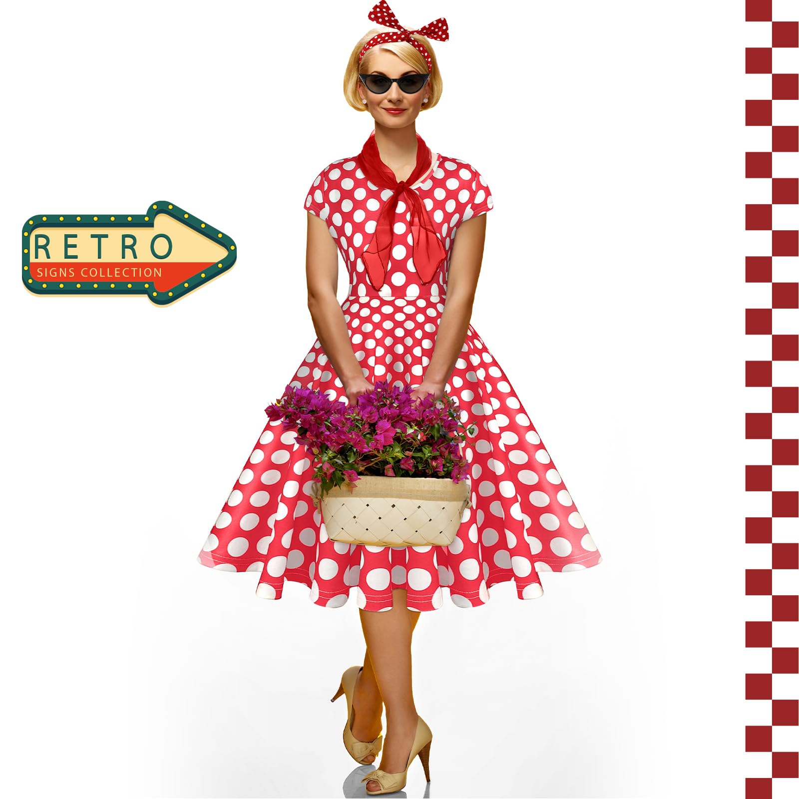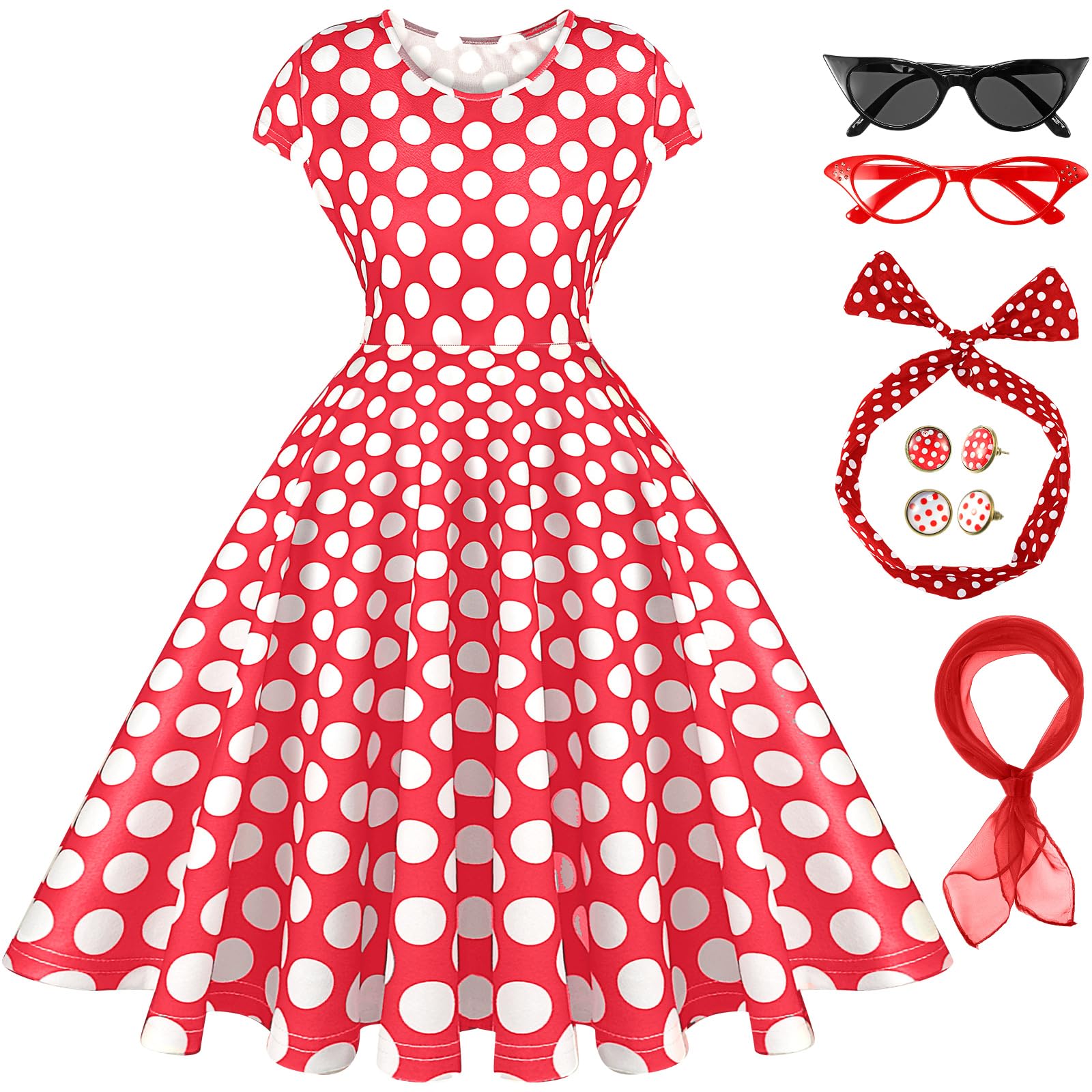 - Women Vintage Costume: contain a pieces of 50s polka dot dress, 2 pairs of 50s cat-eye glasses, 1 pieces of retro 50s chiffon scarf, 1 pieces of bandana tie headband and 2 pairs of drop dot earrings; You can easily mix and match to create a variety of fashionable and nostalgic looks