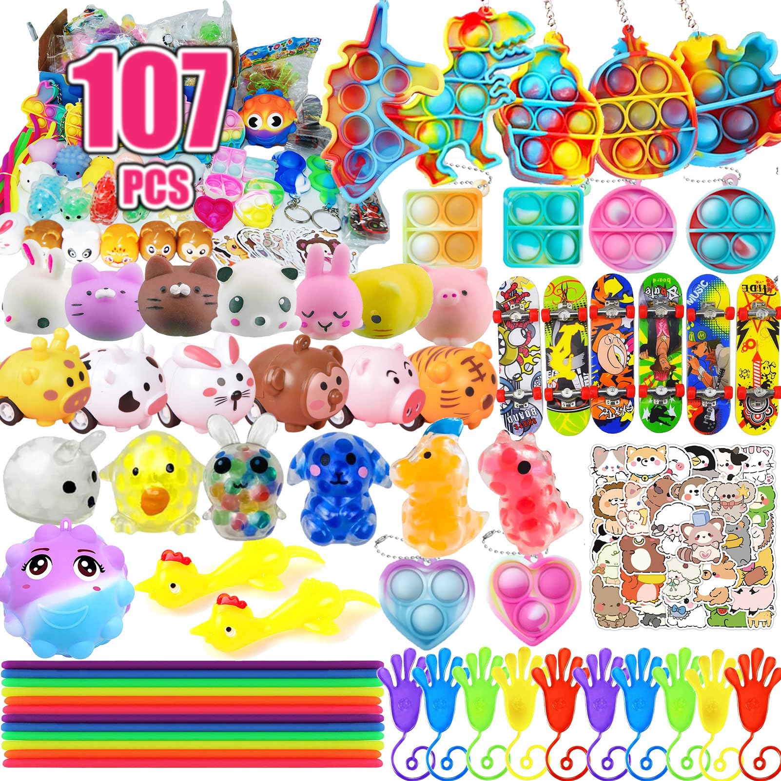 - Super cool Assortment toys:107 pc Party Favors Provide 6-10 kids party toys,include 4 Mini Push pop Keychain,2 Sling Shot Chickens, 10 mini Stretchy String, 6 Mochi, 6 Finger Skateboard, 4 cute animal car, 10 Sticky Hands,4 Mini Pop it toys,60 Animal stickers, 4 Squeeze dinosaurs.