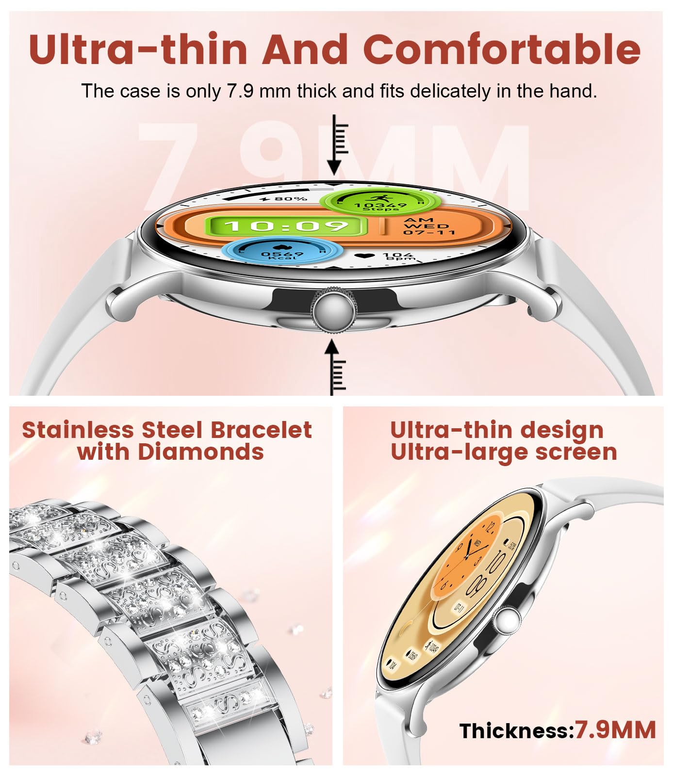 - 【Sleek & Luxurious Design】This lightweight silm smart watches for women (7.9mm thin) is designed with ergonomics for maximum comfort. It’s the perfect accessory for women who value both style and functionality, whether during workouts or everyday activities. The stunning diamond-studded metal band adds a luxurious, jewelry-like feel—far beyond ordinary silicone or mesh straps. Sparkling with every movement, it transforms your smartwatch into a statement piece, perfect for both casual and formal occasions. Elevate your style effortlessly while enjoying cutting-edge technology at your fingertips. (Includes instructional videos to help you get started.)