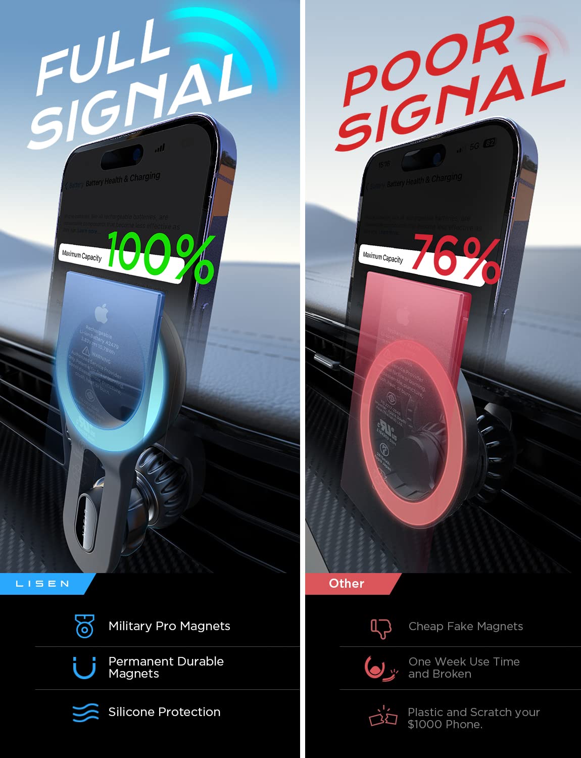 - More Stable, Less Blocking: LISEN has upgraded this magsafe car vent mount from 3 directions.①Upgrade extension arm to protect your phone overheating crash; ②Cell phone holder for car mount with most stable 'Steel Hook';③Magnetic phone car mount that has the strongest magnet force, which can hold up to 10 iPhone 14 Pro Max. LISEN provides at least 1 years of user service. The incompatible car models as below: Mercedes A-Class, Mercedes C-Class, Smart, W213 benz E-Class