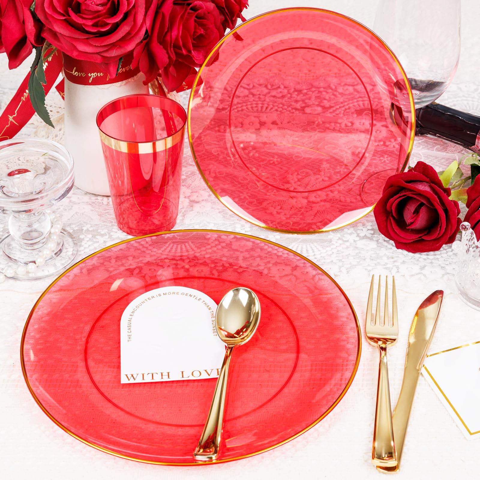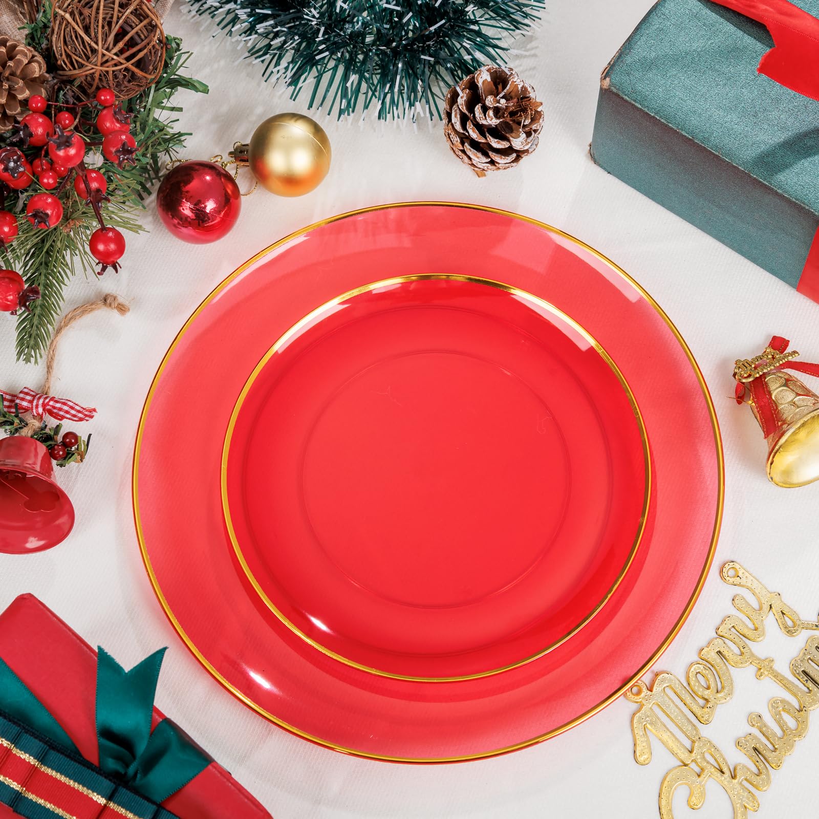 - EXQUISITE DESIGN:Our unique clear red disposable plates are designed to impress with their vibrant color and elegant look,let your guests feel delighted and satisfied.Elevate your Christmas party supplies to a whole new level!