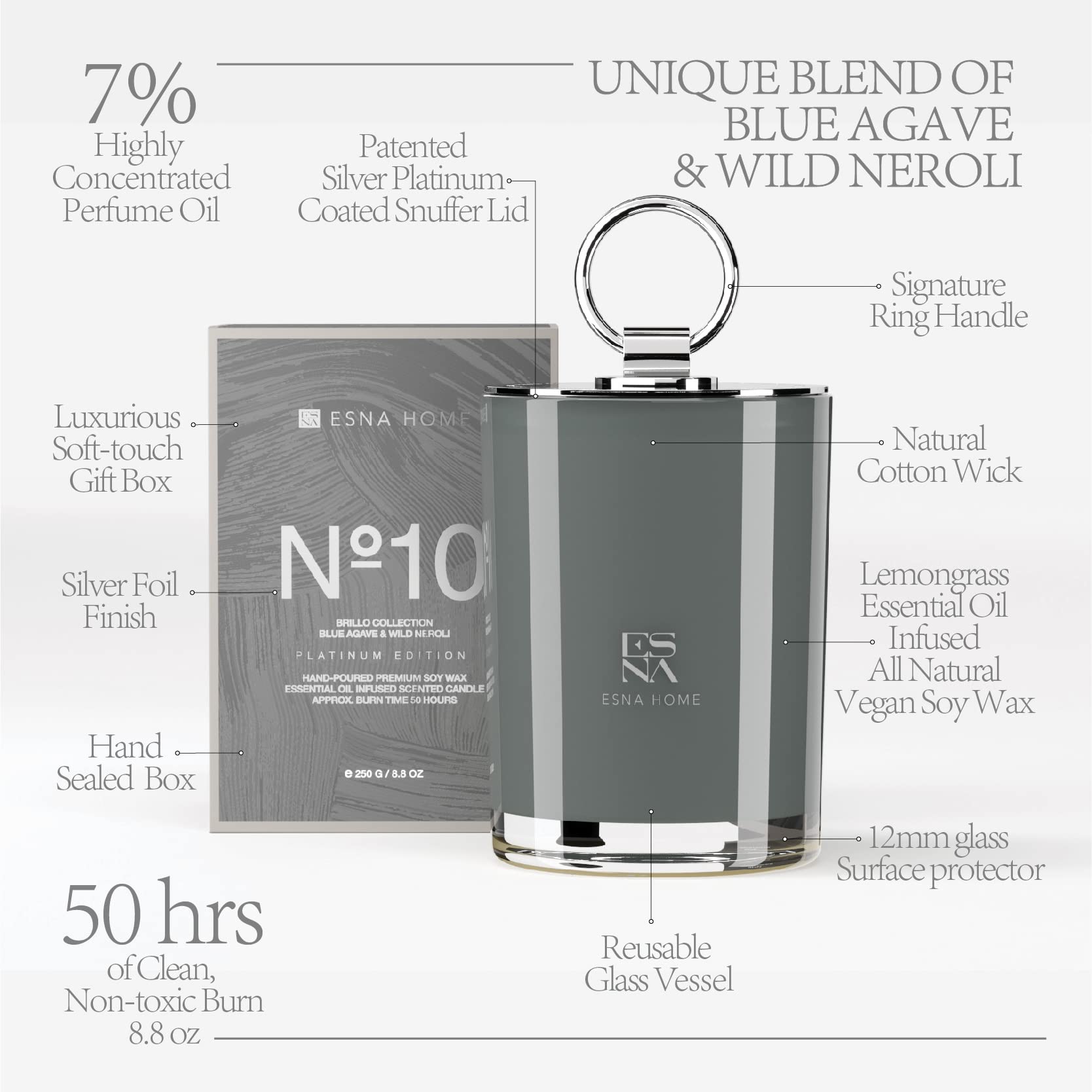 - ★ NEW COLLECTION | The newest addition to the distinctive Brilllo Collection by ESNA HOME, No.10, is a sophisticated, one-of-a-kind infusion. An expertly blend of high-quality botanical fragrance, enriched with crisp citrus oils, pure and fresh notes of Blue Agave, finished off with the indulging aroma of cocoa and Vanilla. Our small batch natural candles are made using 100% pure lemongrass essential oils, for a fragrance that infuses the home with a rich aroma.