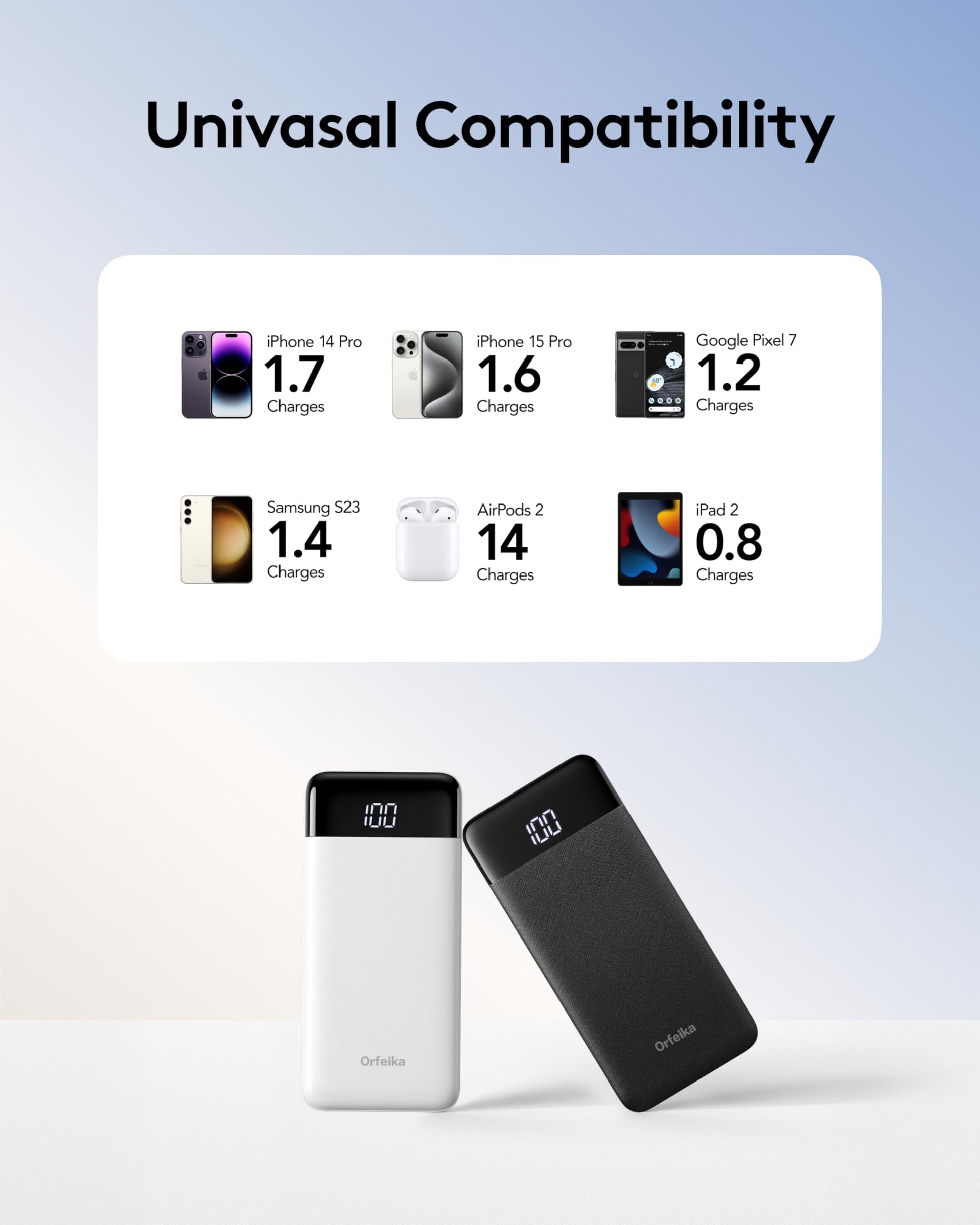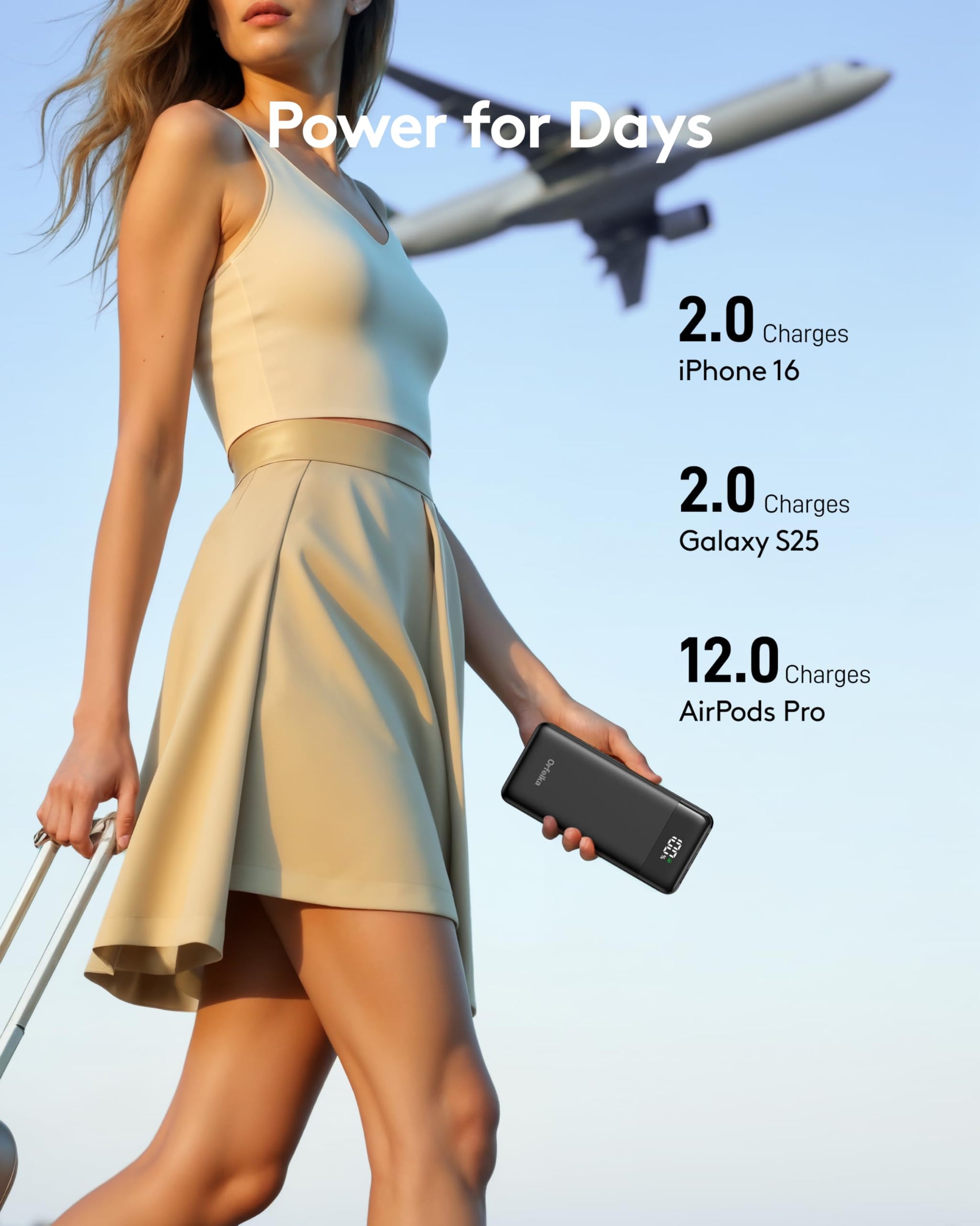 - 【Ultra-Slim & Travel-Ready Portable Charger】 Engineered to be as think as a smartphone (0.59in) and lighter than a soda can (8.4oz), this pocket-sized power bank slips easily into bags, pockets, or purses for on-the-go convenience.