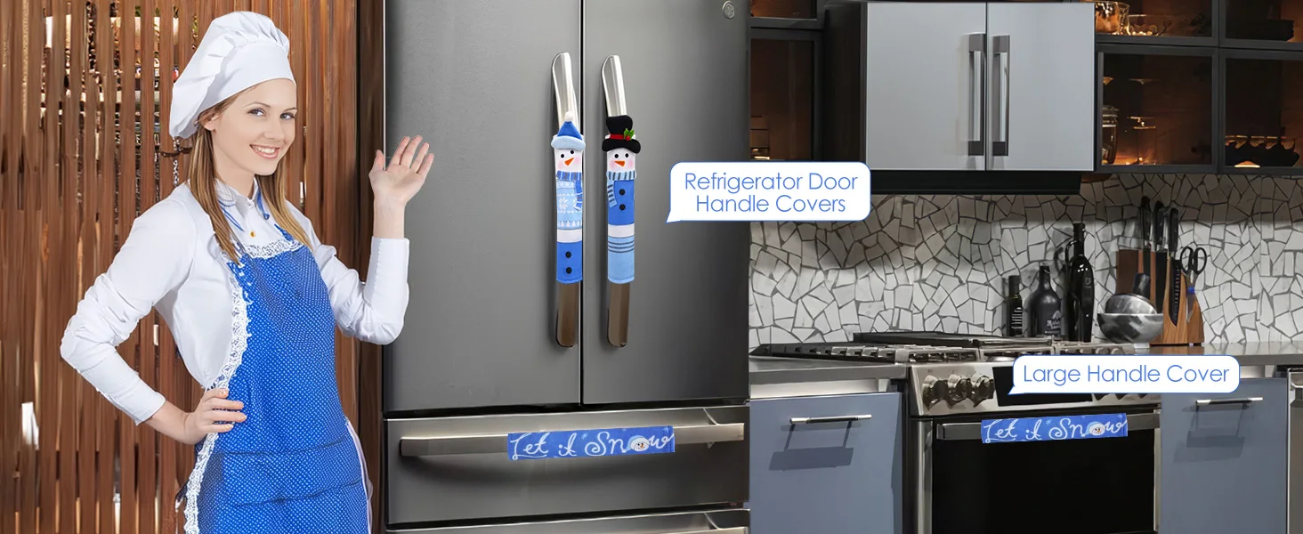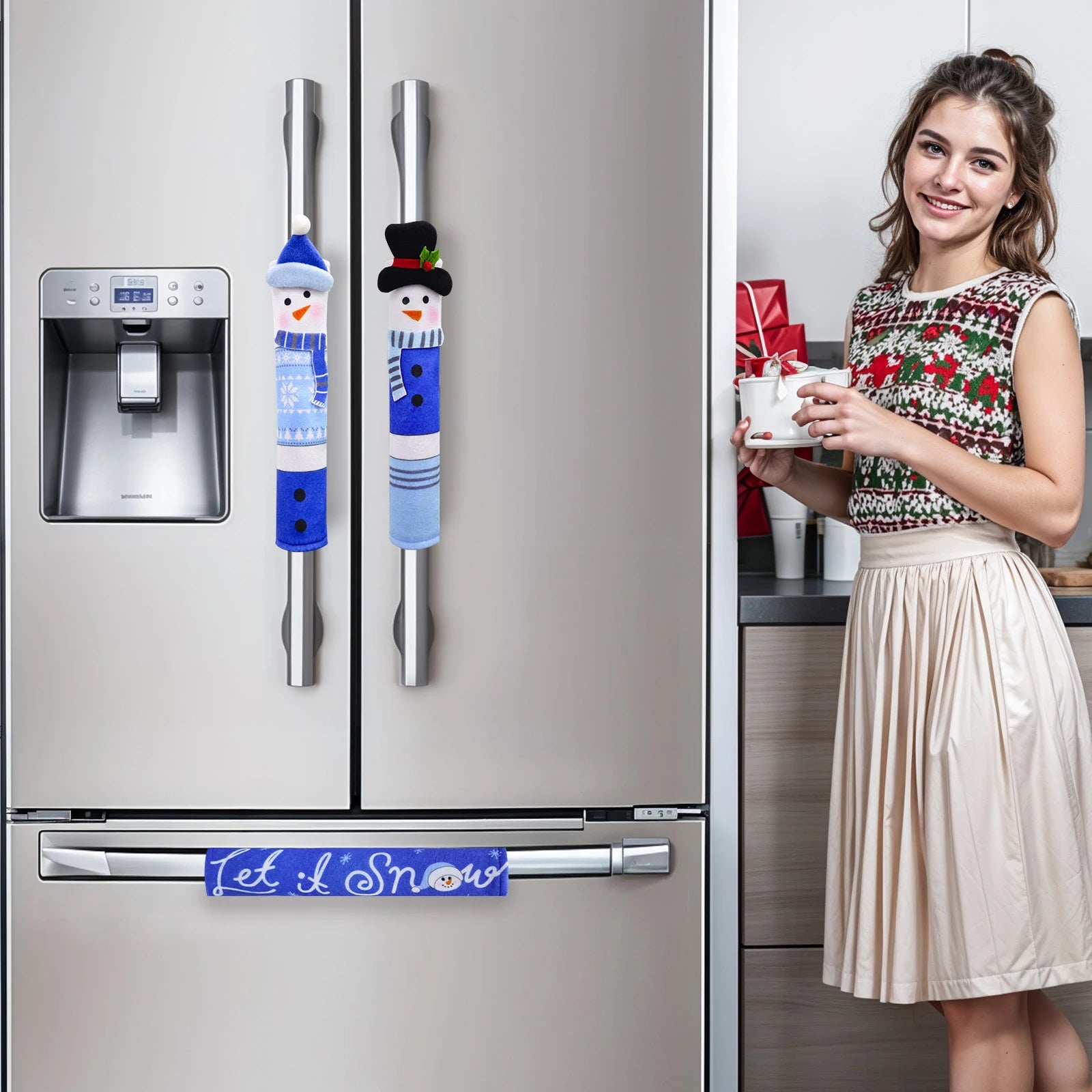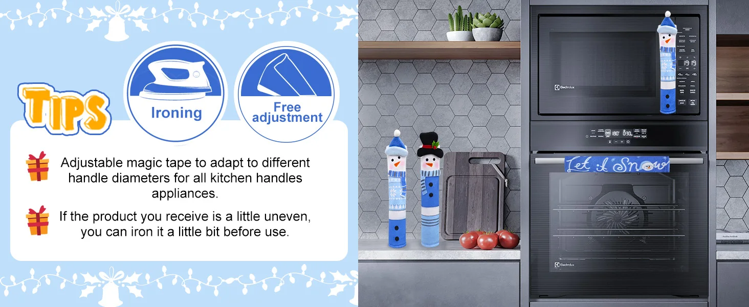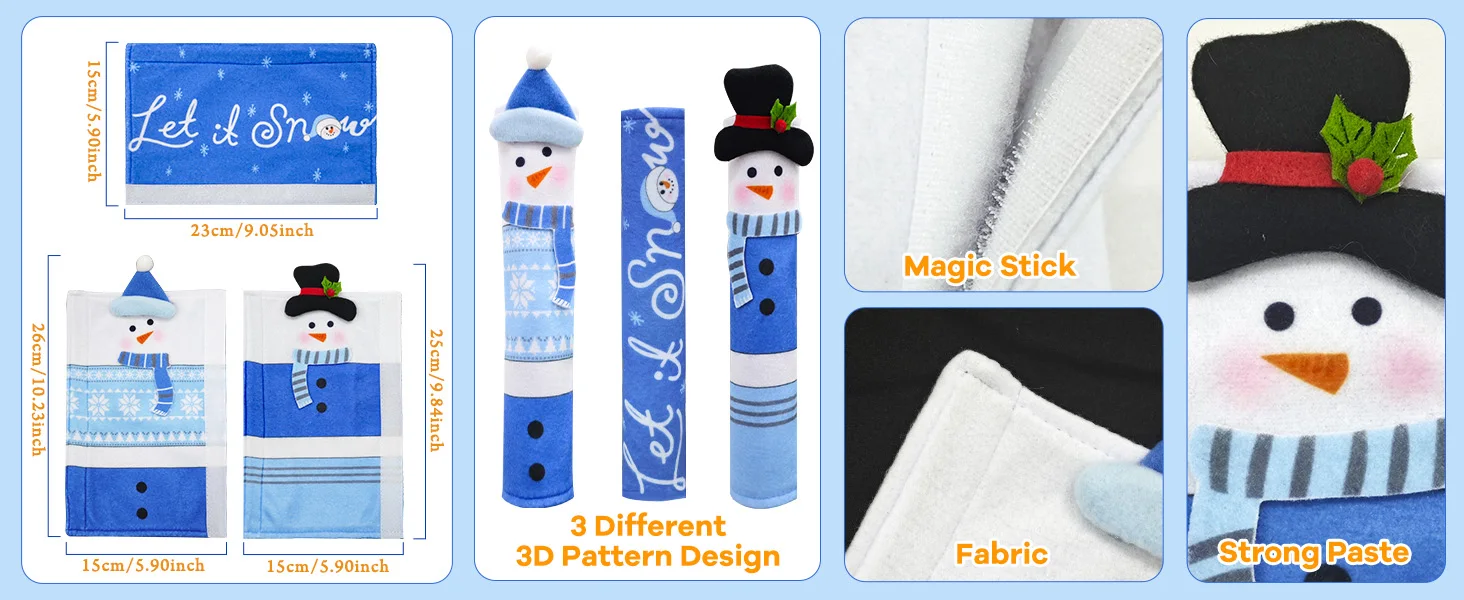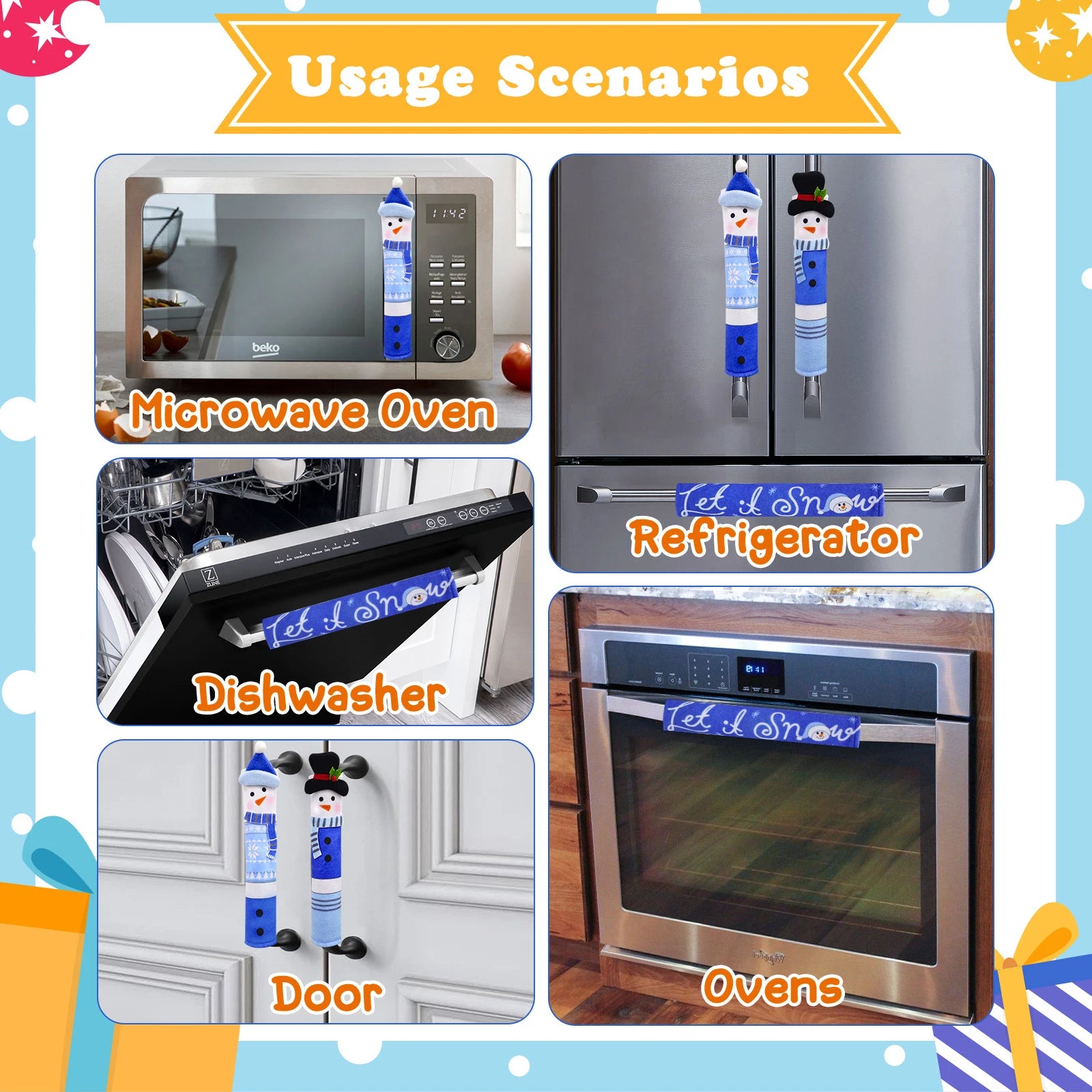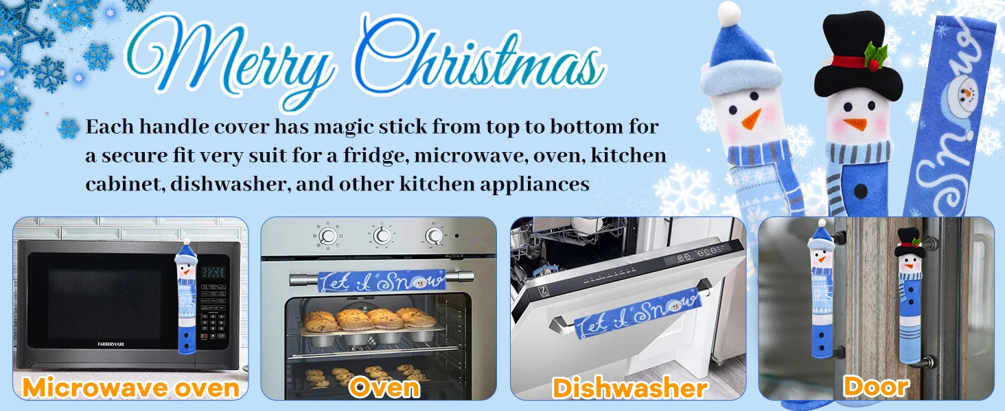 - Snowman Decor: The microwave handle covers features delightful blue Christmas decorations snowman designs, including a snowman with a Santa hat, a snowman with a top hat, and a "Let it Snow" design. These covers add a cheerful holiday touch to your kitchen while protecting your appliance handles from daily wear and tear