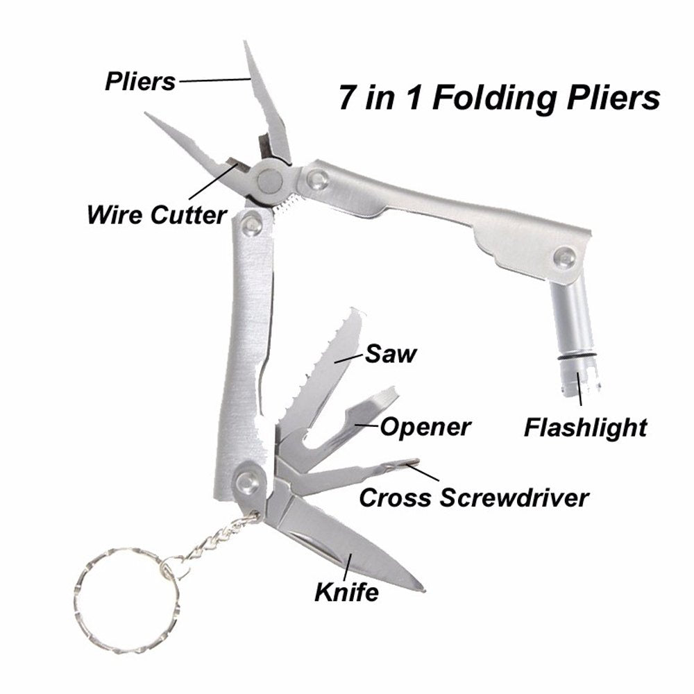 Folding Pliers: With pliers, wire cutter, saw, bottle opener, cross screwdriver, knife and light.