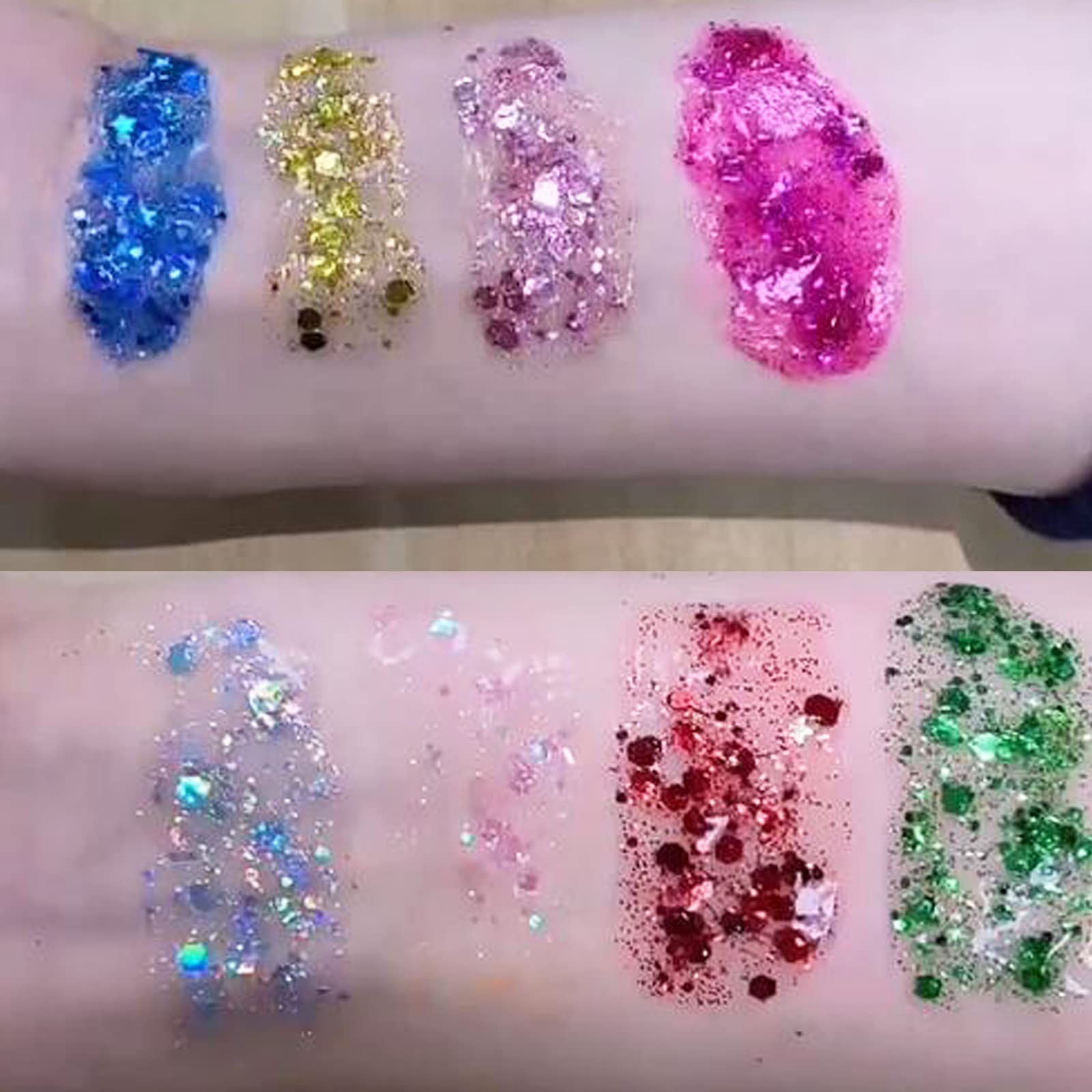 - WIDE APPLICATIONS --- This cosmetic chunky glitters flakes gel perfect for your body from head to toe: face, body, eyeshadow, lips, cheeks, hair, nail art, and more. On the body, dust some on the collarbones and shoulders for a super shimmering effect