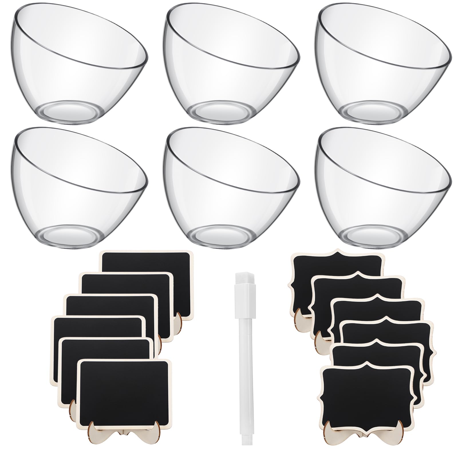 - Comprehensive Set for Every Occasion: enhance your gatherings with a complete set of 6 slanted acrylic serving bowls and 12 mini chalkboard signs, including 1 liquid white marker; Ideal for a variety of events, this set caters to your everyday needs and allows you to share the experience with friends and family