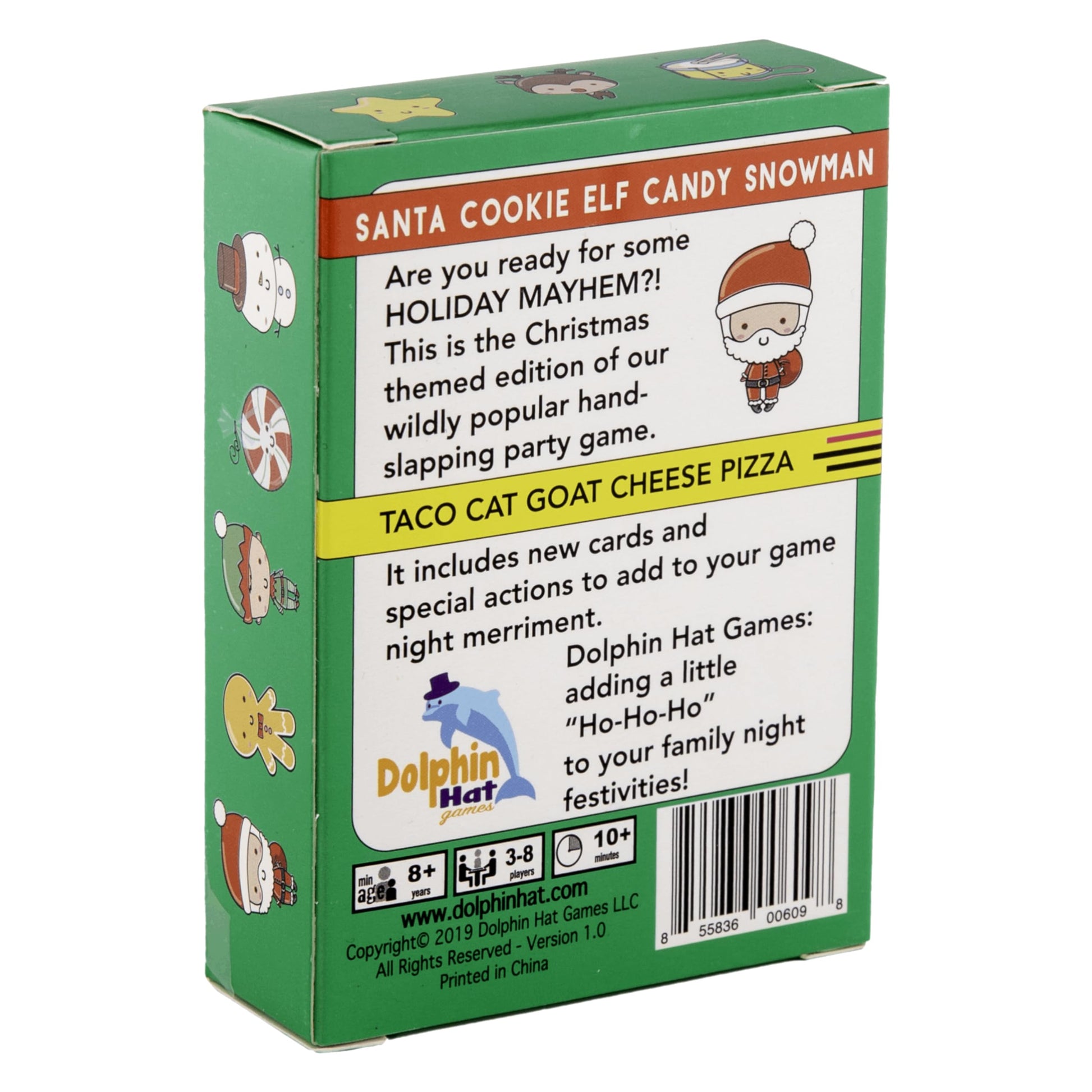 Details: Santa Cookie Elf Candy Snowman is the Christmas themed edition of our wildly popular part game Taco Cat Goat Cheese Pizza!