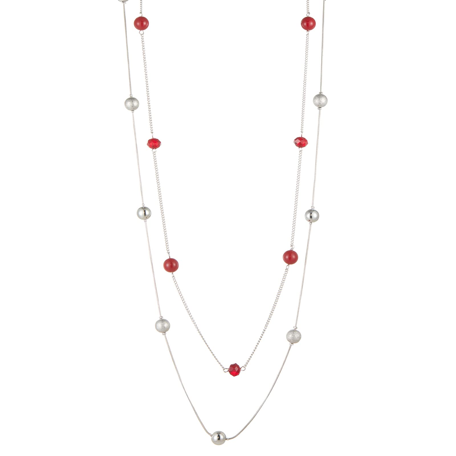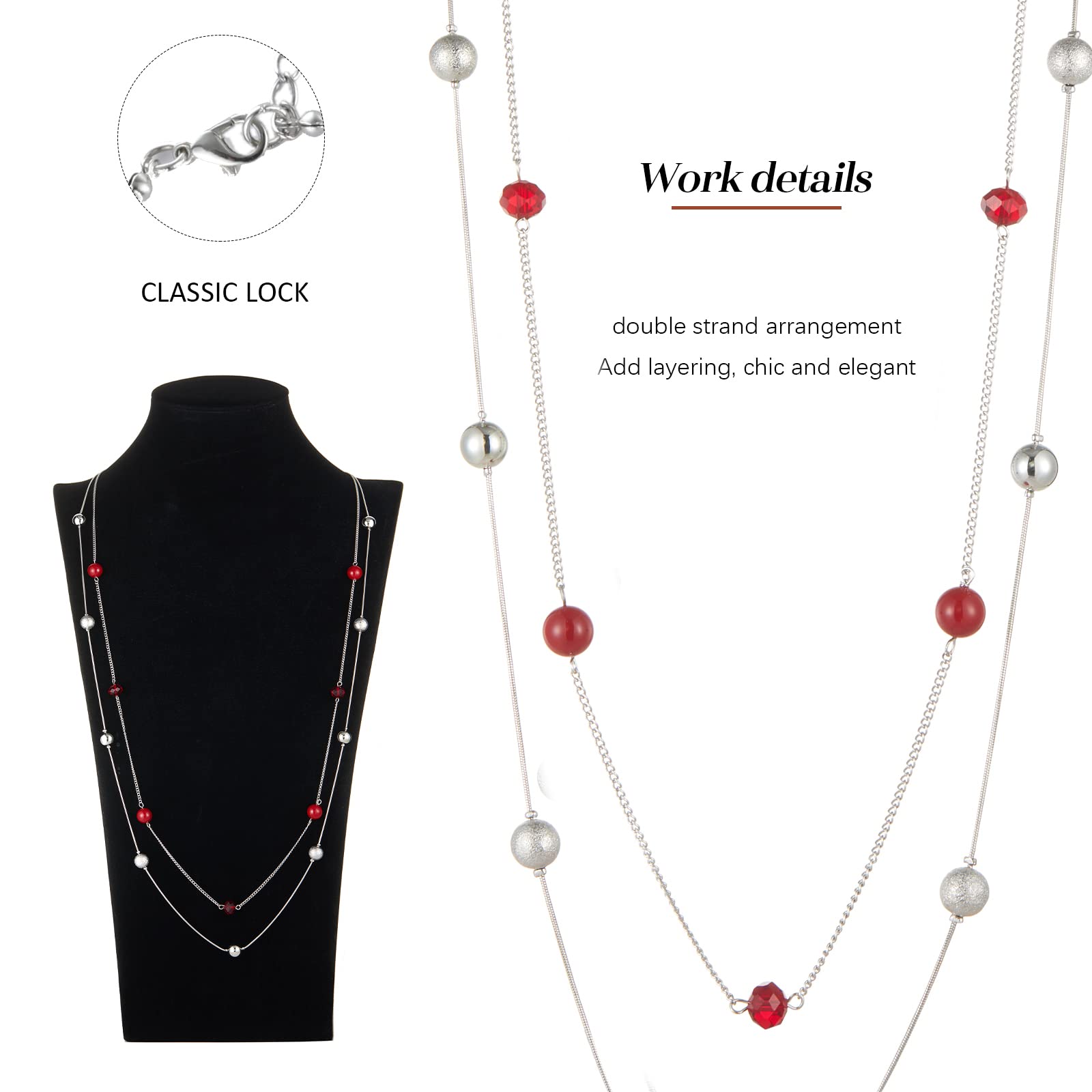 Silver Layered Long Necklace for Women Pearl Crystal Sweater Strand Chain Necklaces Fashion Gifts (Red)