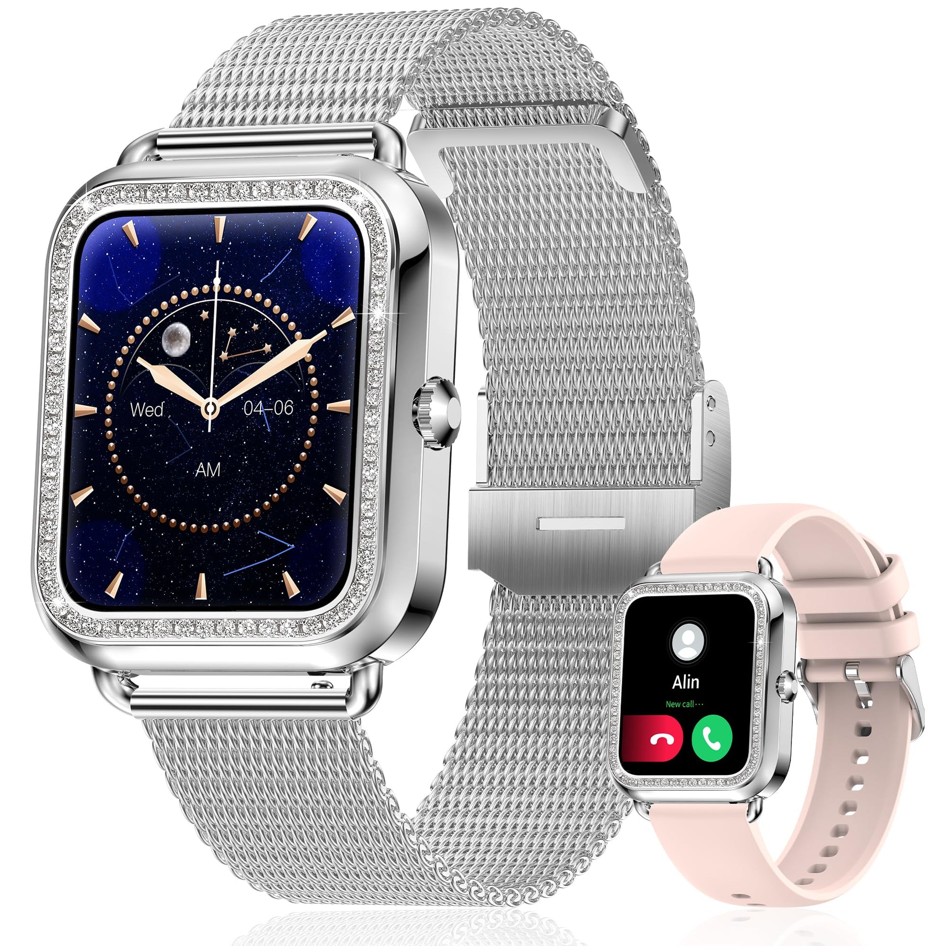- 【1.59'HD Full Touch Screen & Custom Watch Face】1.59' HD touch screen with delicate metal bezel provide excellent picture quality and high-sensitivity touch while being scratch-resistant. The fitness watches for women has 180+ watch faces in different styles to choose from in free, and you can also DIY the watch face with your favorite photo. Comes with 2 kinds of bands, delicate stainless steel and soft silicone, it 's suitable for dating, parties, daily, sports, all occasions.