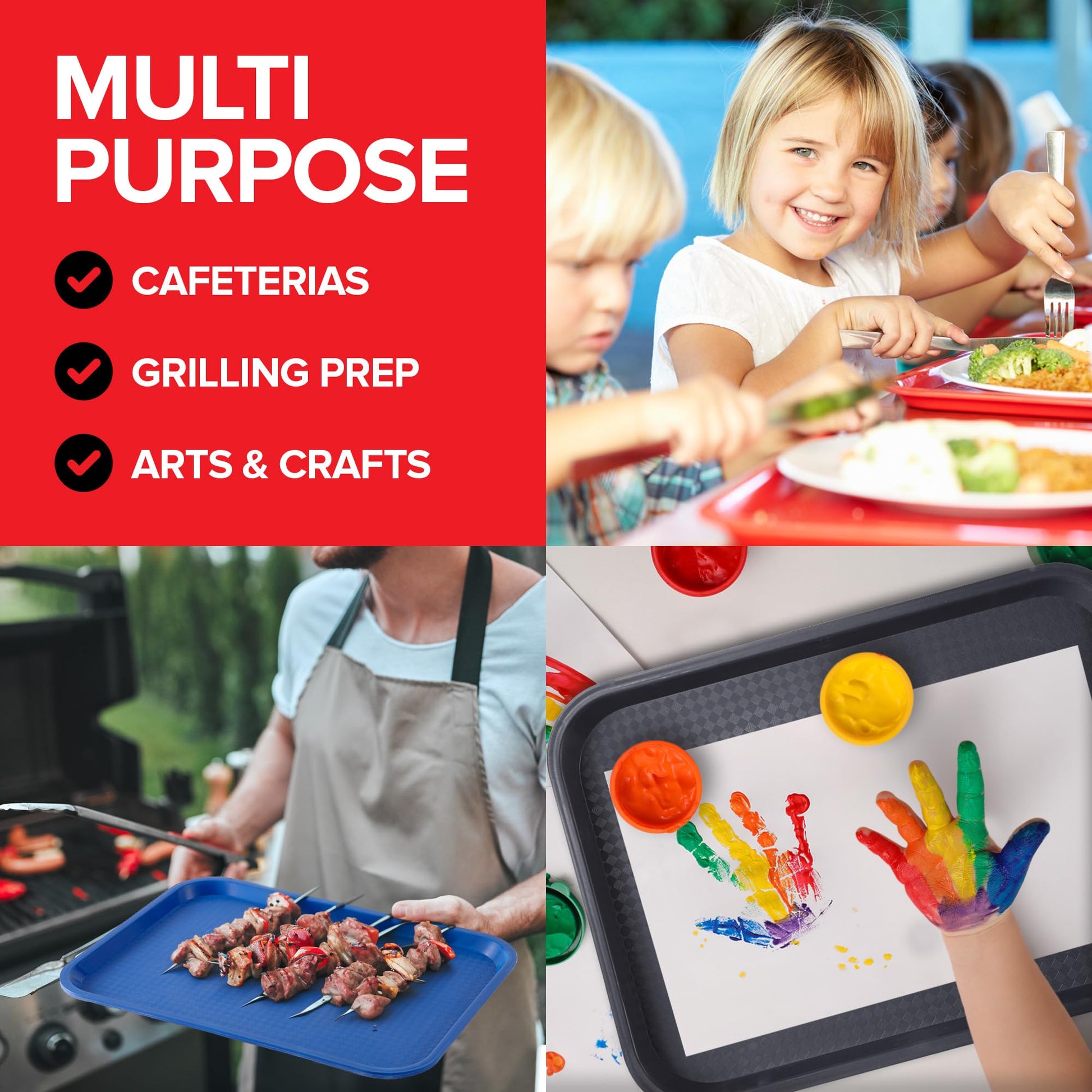 - Multipurpose: Our plastic trays are convenient for cafeterias, fast-food restaurants, schools, catering carts, grilling, arts & crafts, and more!