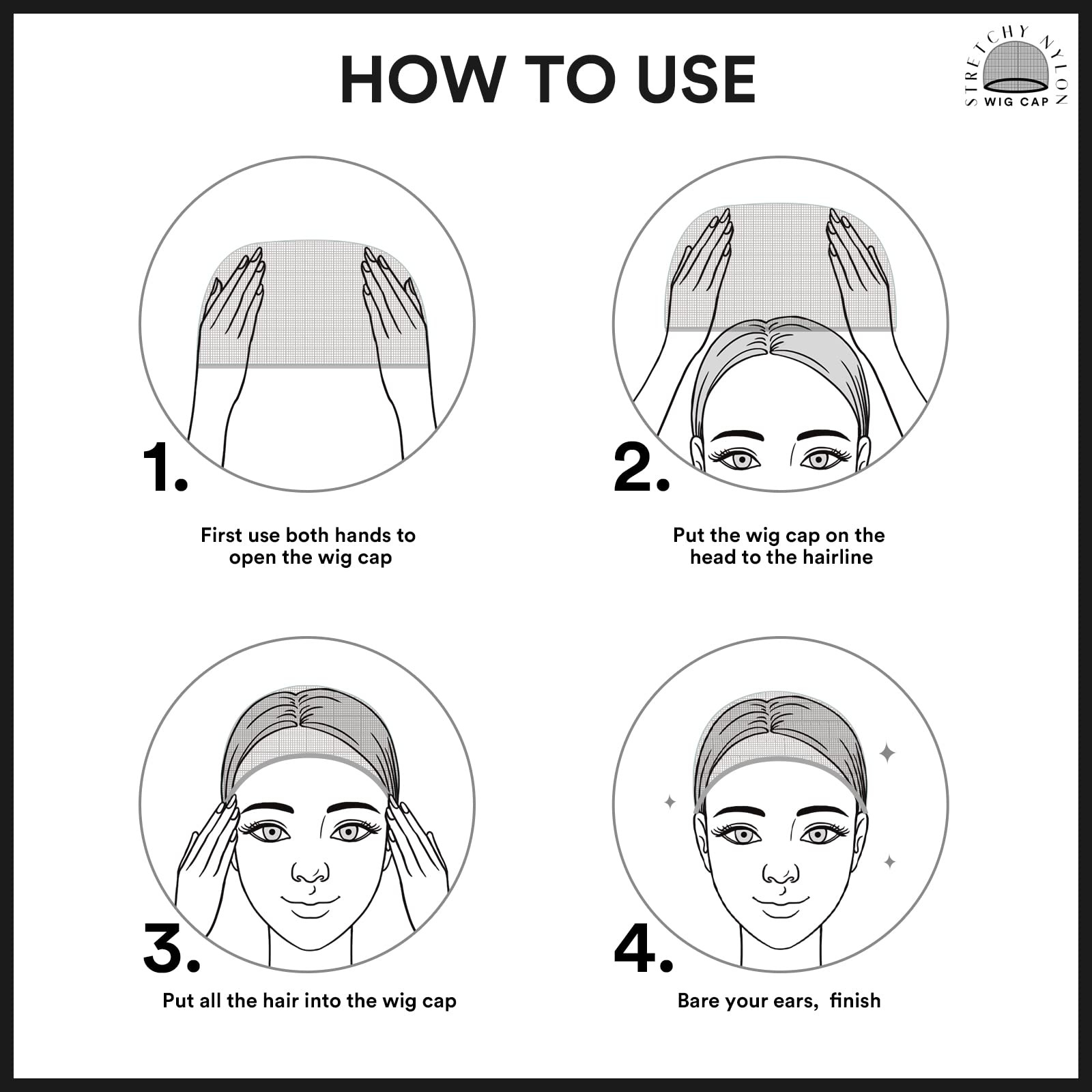 - Widened Elastic Straps Fasten Firmly: Wide elastic band protects your skin from the itchiness of the lace front and prevents the wig cap and wig from slipping off. If your hair is long and thick, please tie your hair into a ponytail and pin it as flat as possible on your head before using wig cap to make sure that your hair won't fall out