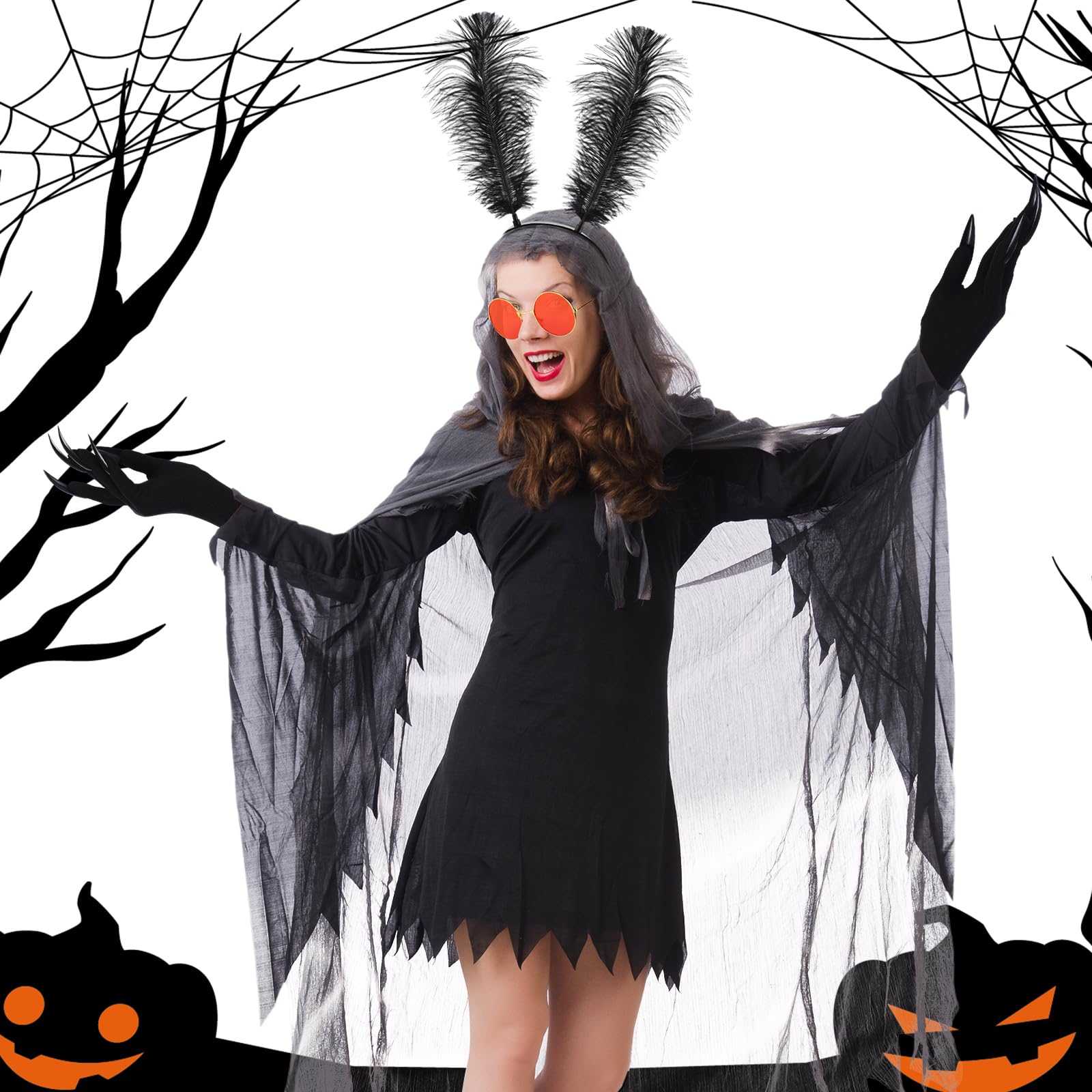 - Halloween Mothman Costume: our package includes 1 pair of black long claw gloves, 1 pair of red plain lens sunglasses, 1 pcs feather headband, this costume set caters to your cosplay look needs, you will stand out at Halloween and your party