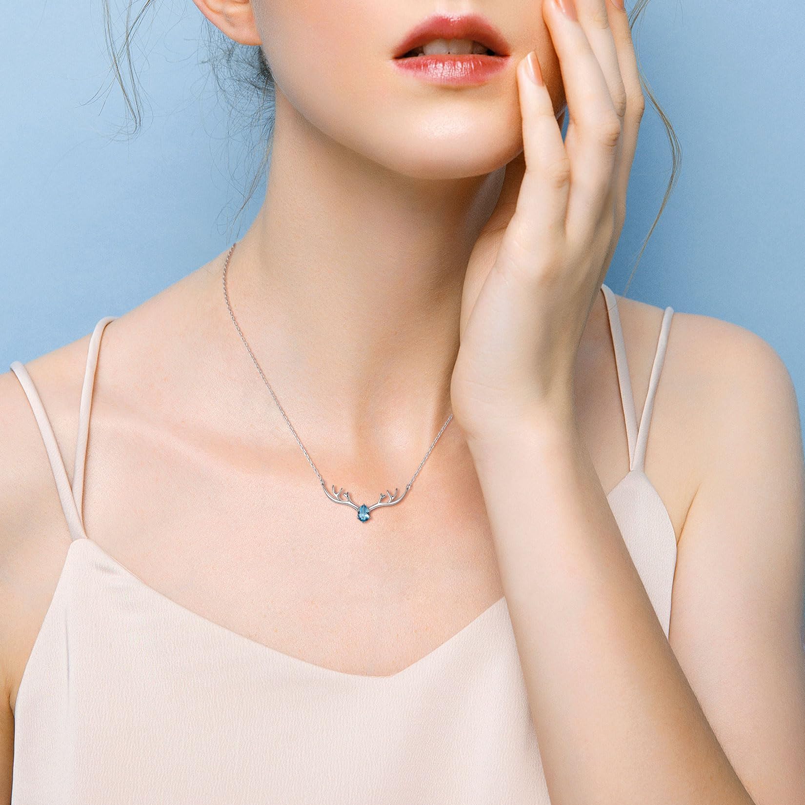 U7 Women Collar Necklace March Birthstone Aquamarine Jewelry Sterling Silver Lucky Reindeer Antler Necklace 16"-18"